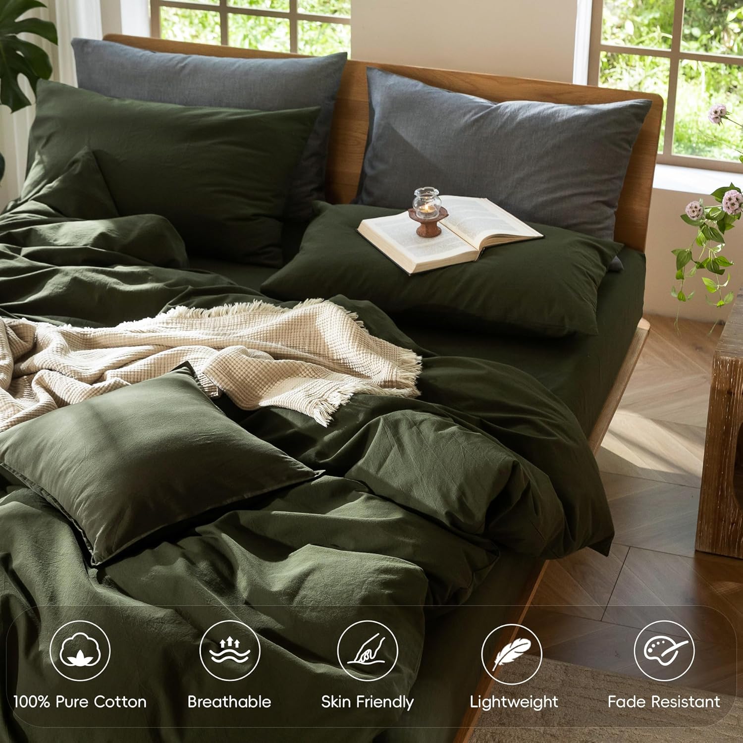 Great Texture & Comfort: Looks like linen, feels like cotton, with a lived-in, slightly wrinkled look, which offers that feeling of staying at a nice resort where the duvet cover sets are always crisp, clean and comfortable. The relaxing look of this olive green bedding set and the cool texture make it hard to get out of bed.