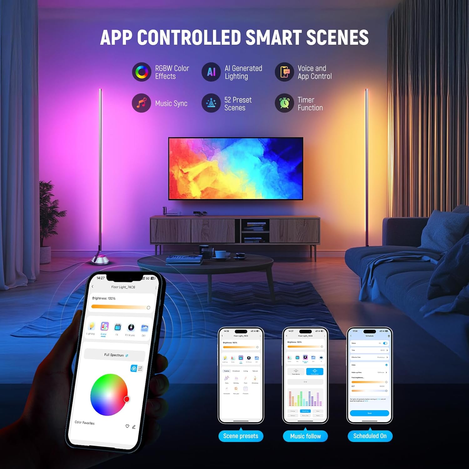 【Thoughtful Timer Function】 Easily schedule on/off times with custom brightness, color temperature, and duration. This cool floor lamp is also ideal as a dim sleep light for sensitive users or a safe night light for late night movement, enhancing comfort and sleep quality. Note: Only compatible with 2.4GHz Wi-Fi routers or mobile hotspots. 5GHz is NOT supported