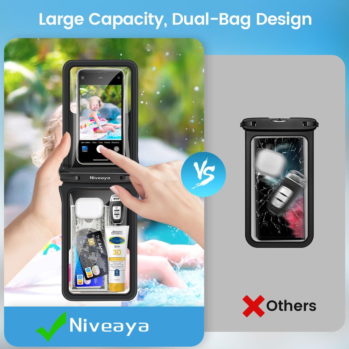 Niveaya Double Space Waterproof Phone Pouch (2-Pack) – IPX8 Cell Phone Dry Bag for Beach, Kayak, Cruise Travel Essentials – Compatible with iPhone 16/15/14 Pro Max & Galaxy S25/S24 Ultra (up to 8.3″)