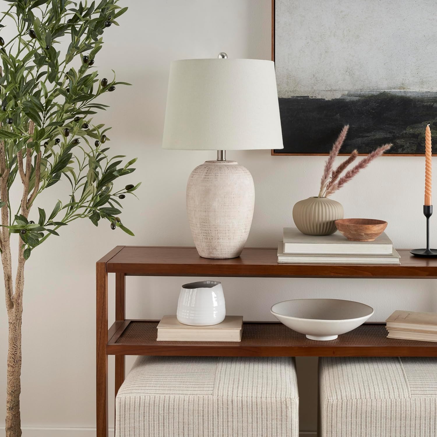 Farmhouse distressed beige table lamp infuses an earthy, organic vibe