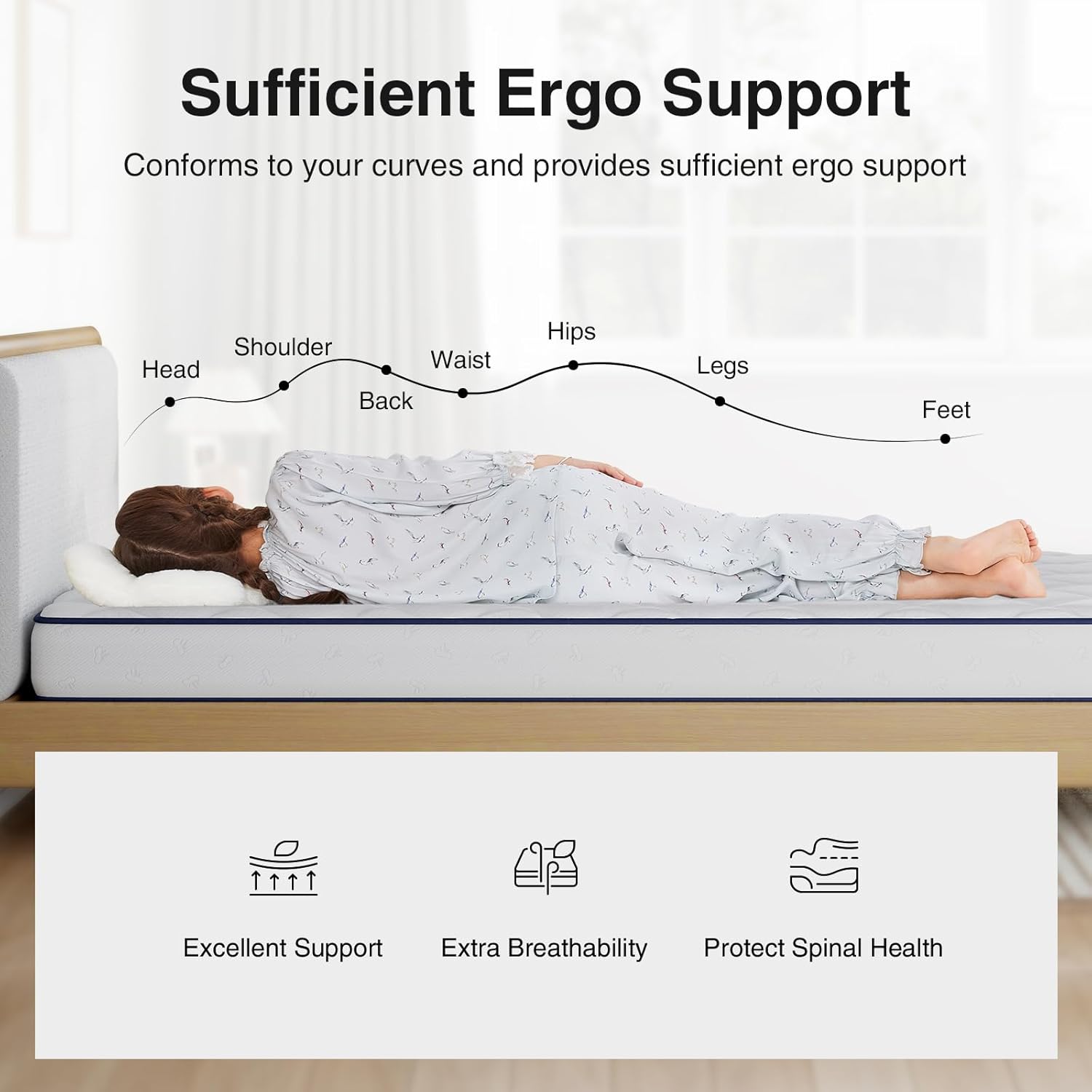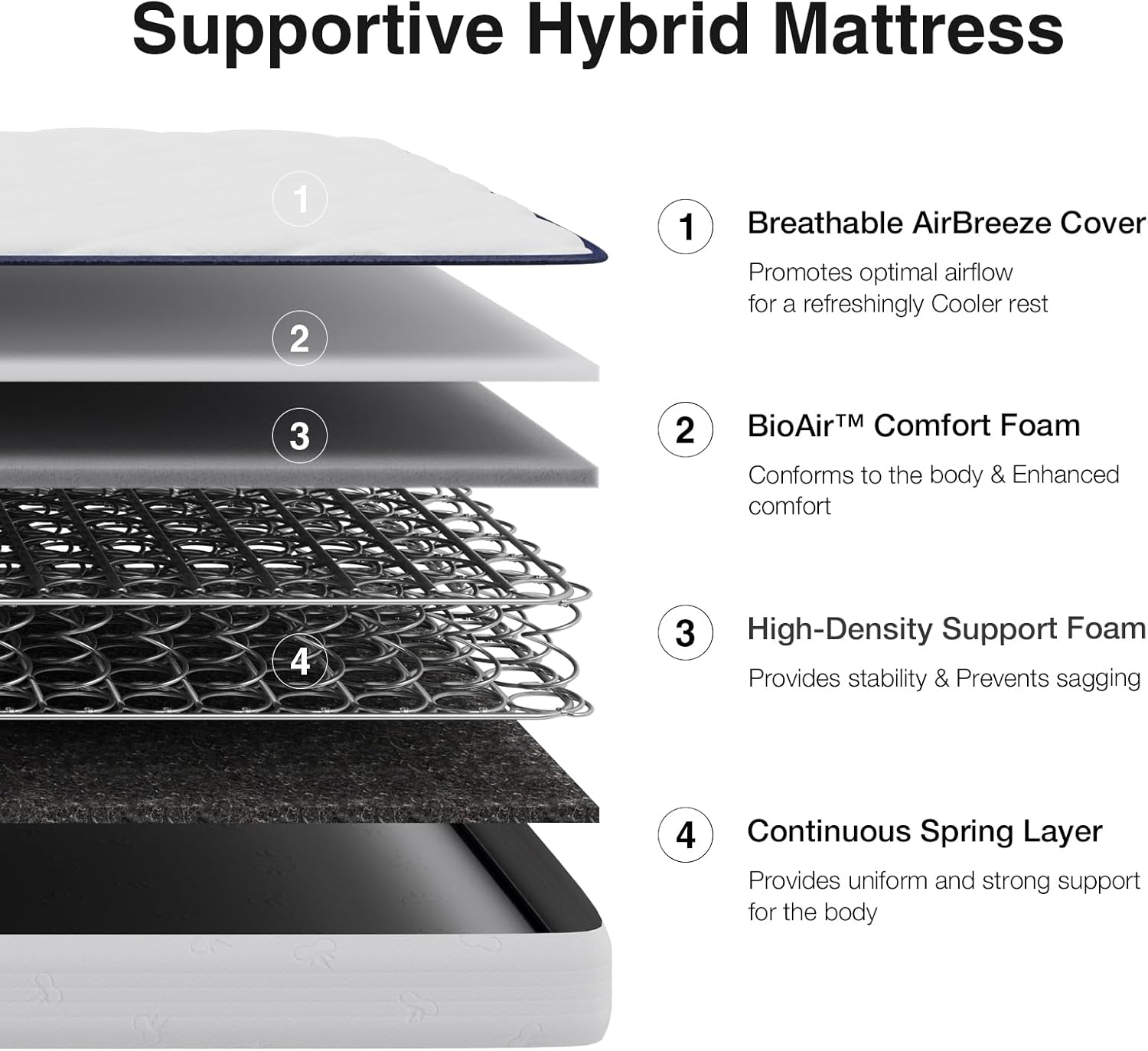 Ergonomic Layered Comfort System:The mattress twin size features high-carbon Bonnell spring grids that dynamically distribute body weight, easing pressure points, plus comfort foam that cushions hips/shoulders.It may help reduce pressure sensation and provide comfortable sleep throughout the night.
