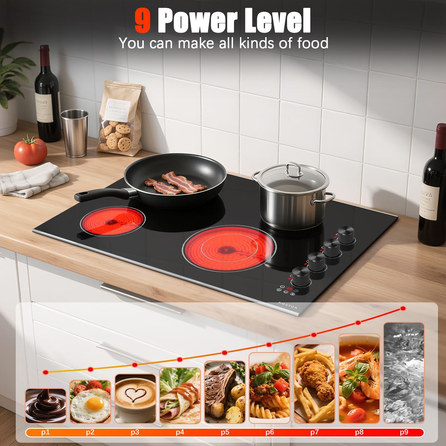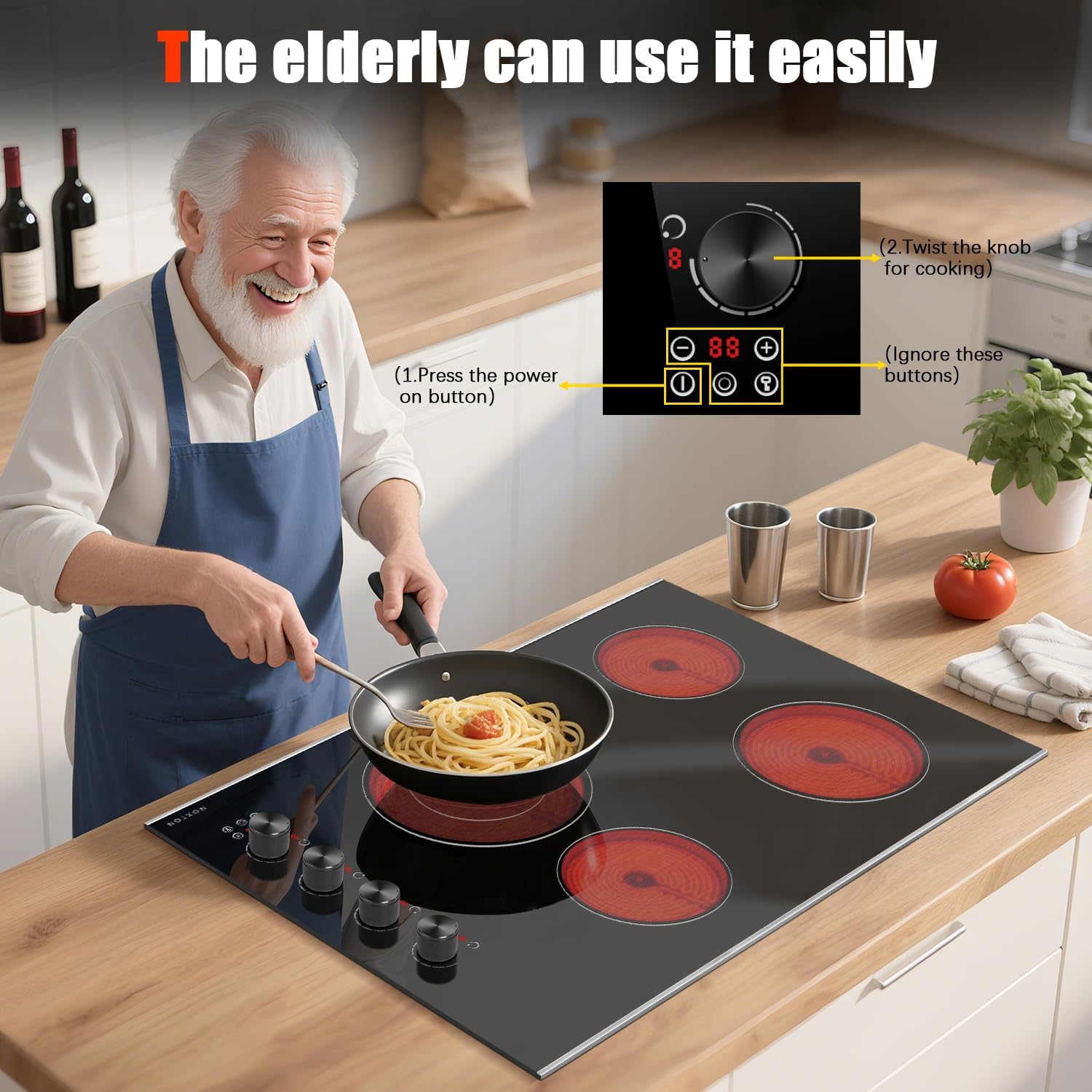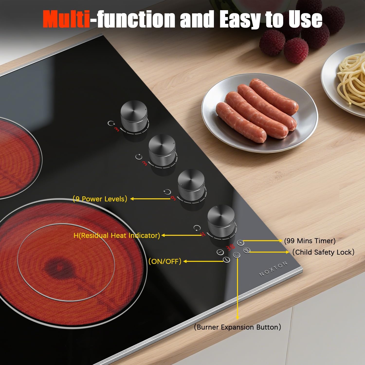 Noxton Electric Cooktop 30 Inch, Knob Control 4 Burners Electric Stove Top with Glass Protection Metal Frame, Expandable Burner, Safety Lock, Timer, 6700W 240V Hard Wired(Black)