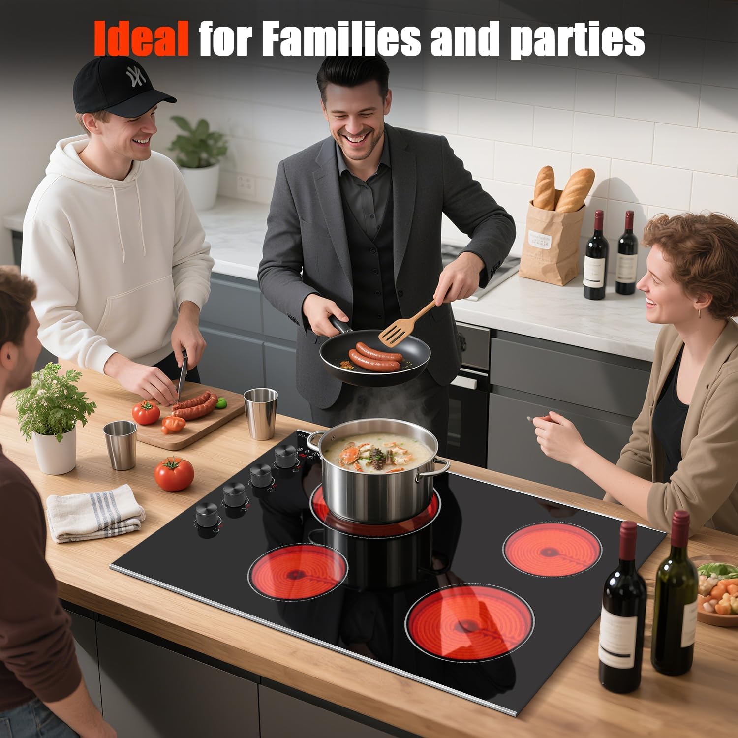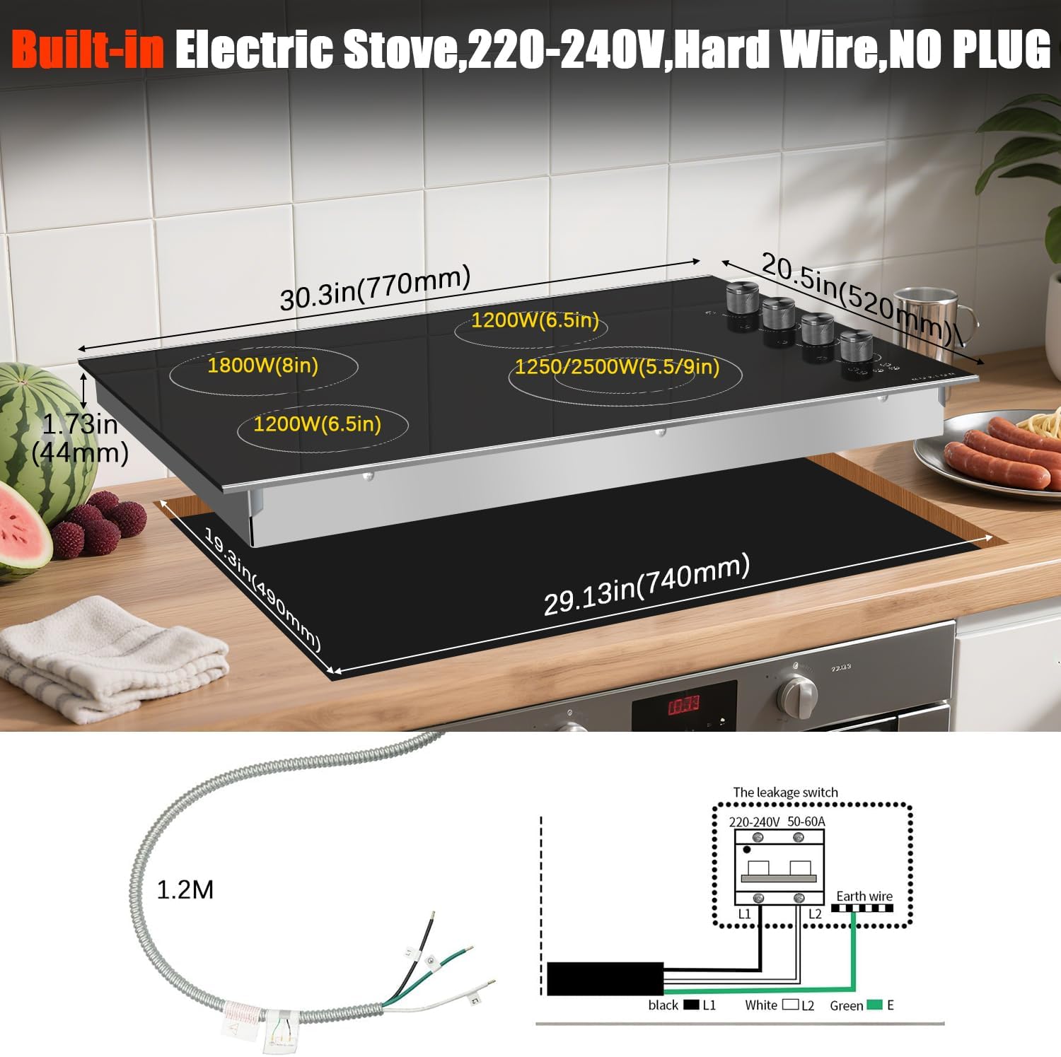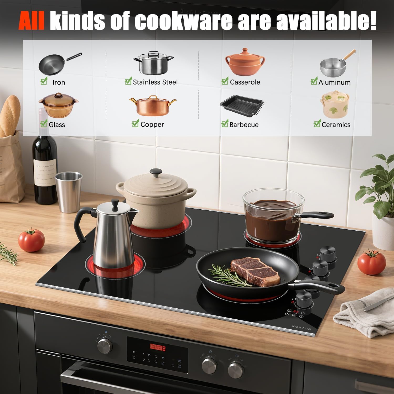 Noxton Electric Cooktop 30 Inch, Knob Control 4 Burners Electric Stove Top with Glass Protection Metal Frame, Expandable Burner, Safety Lock, Timer, 6700W 240V Hard Wired(Black)