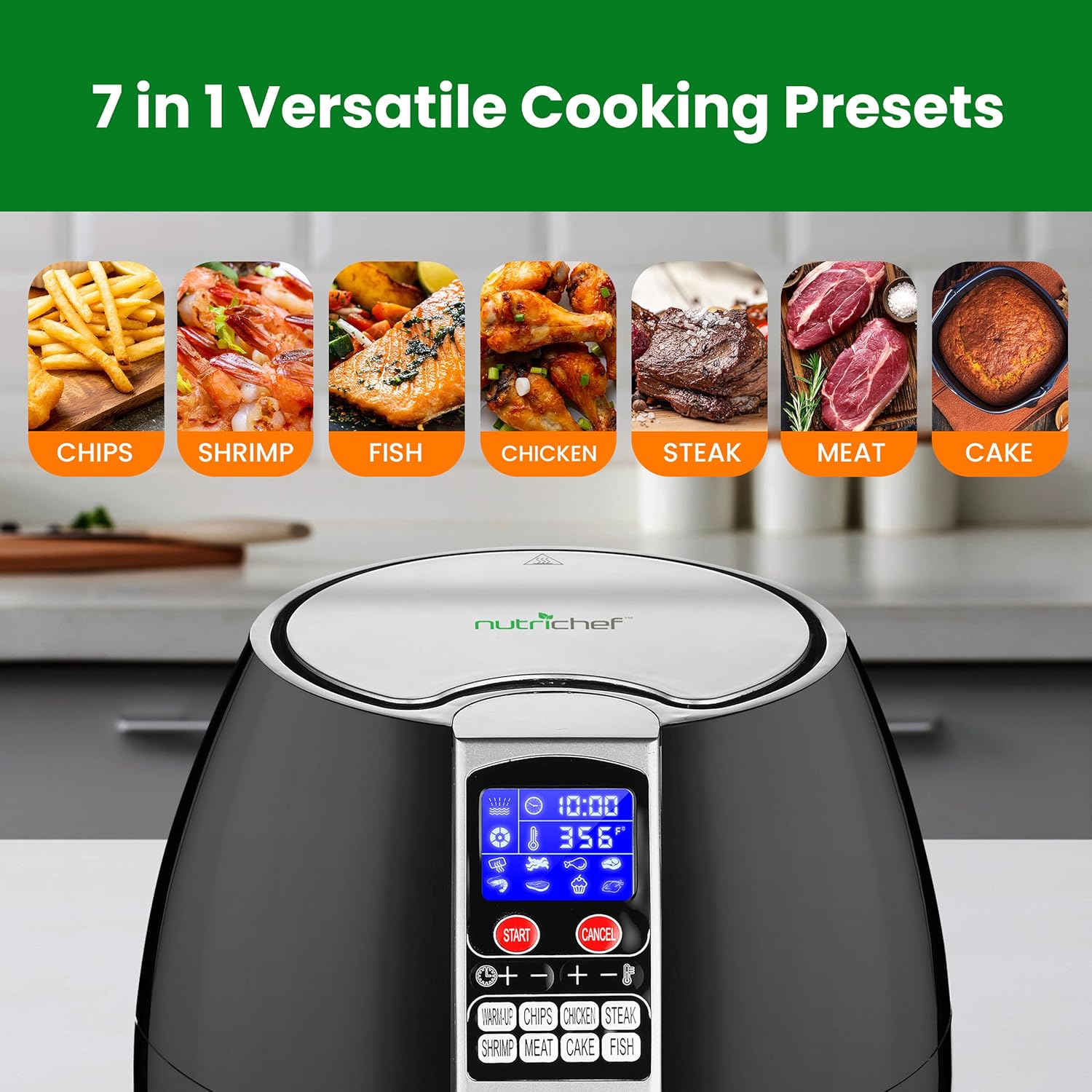 AIR FRYING MADE EASY: The NutriChef 3.7 Quart Portable Air Fryer is a great kitchen companion! Simply insert food into the fryer & set the time & temperature. Cooks scrumptious crispy skins, potato french fries, chicken, steak, fish & more recipes