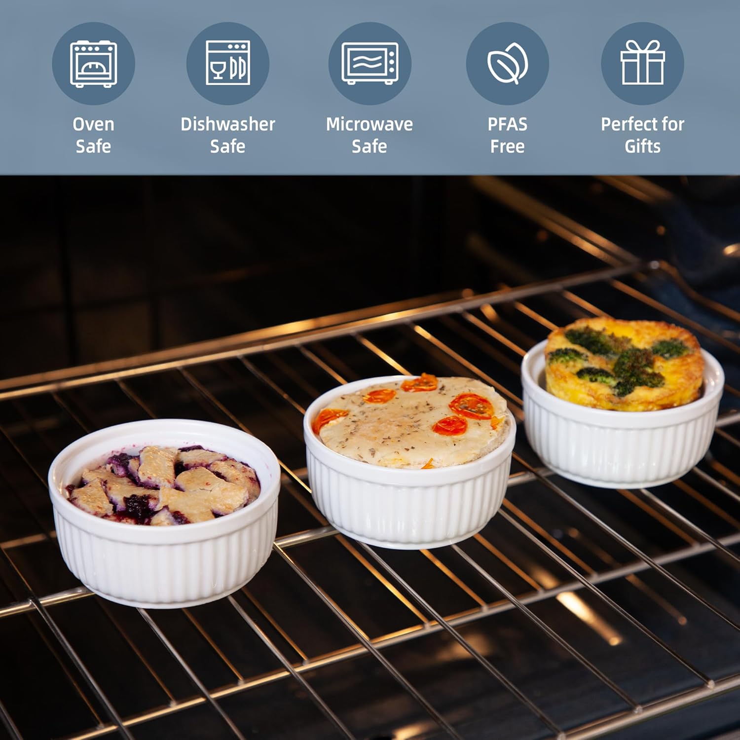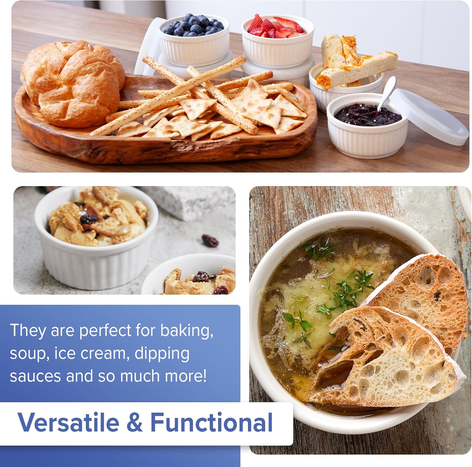 FUNCTIONAL & VERSATILE – The 8 oz ramekins are perfect for baking and serving individual portion sizes of lava cakes, souffle, creme brulée, French onion soup, quiche, eggs, ice cream, or snacks. They are also ideal for serving condiments or dipping sauces.