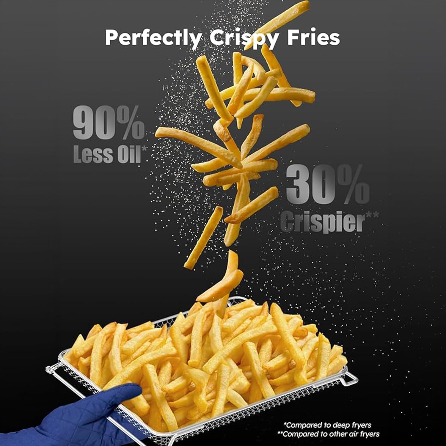 WHAT’S INCLUDED – Bravo Digital Toaster Oven comes with 1 heavy-duty cooking rack; 1 baking pan; 1 removable crumb tray; 12”x9.5” air fry basket; 1 owner’s manual, 1 quick start guide, and 1 recipe book.