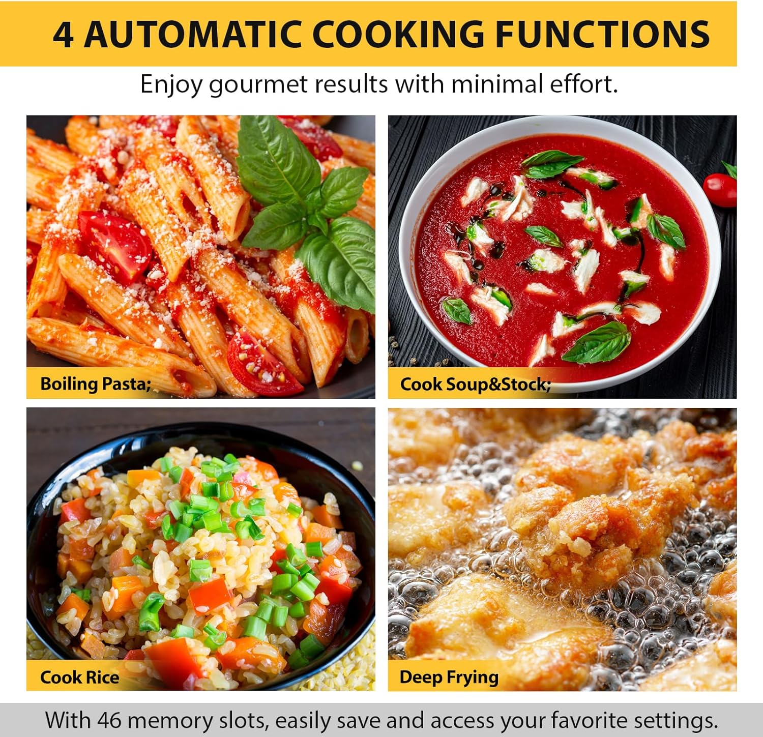 4 NEW PROGRAMMED RECIPES – Experience the automated cooking with innovative programmed recipes. Featuring 4 crafted options—boiling pasta, creating soup/stock, deep frying, and rice cooking—each function is rigorously tested for flawless results.