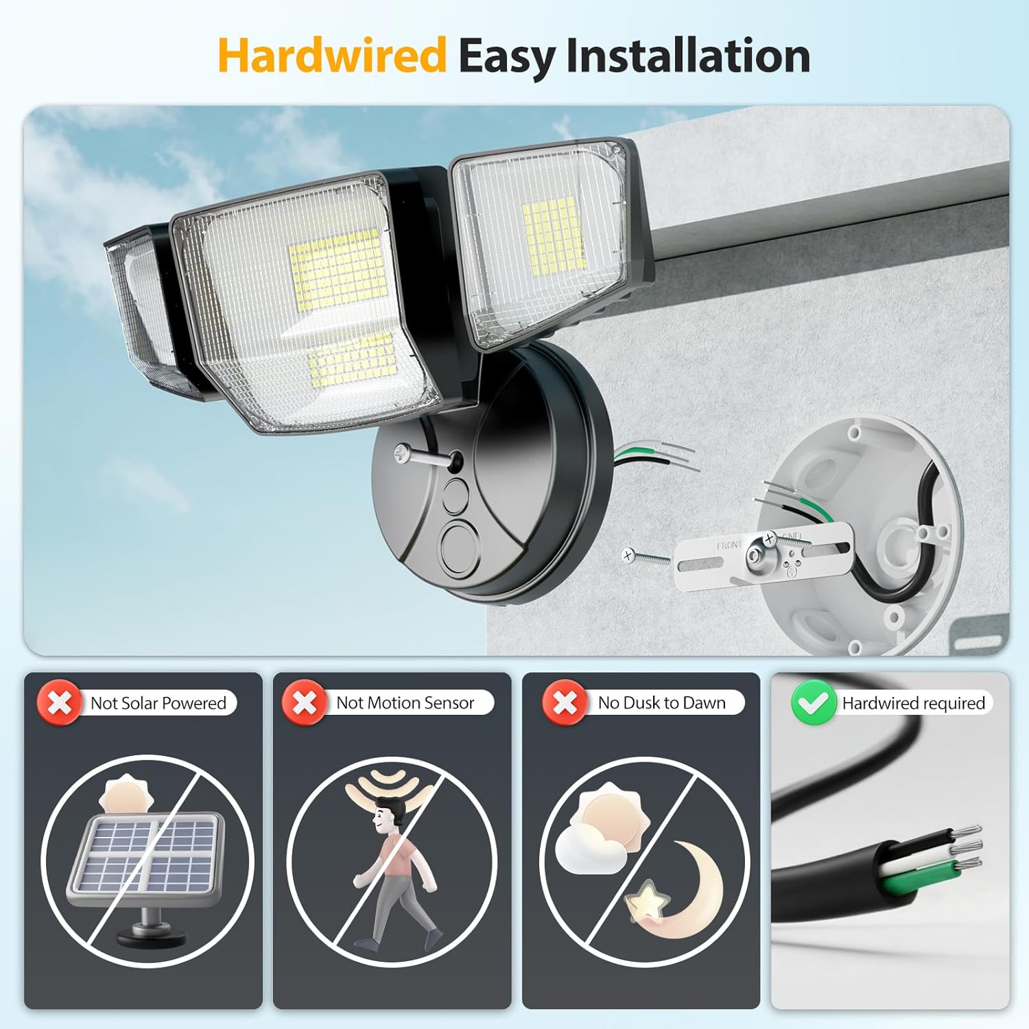 IP66 Waterproof & Install Easily: This eave-mounted floodlight is weatherproof, making it ideal for entrances and yards. Installation hardware and simple wiring instructions are included for easy connection to a junction box