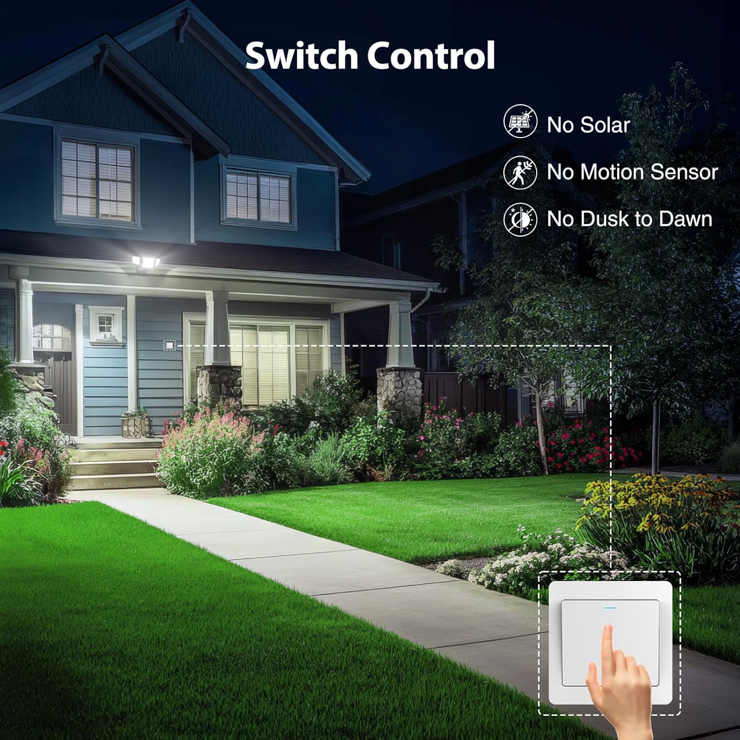 Switch Controlled: This exterior led flood lights is controlled only by wall switch to turn on/off the light. NO motion sensor, NO solar, NO dusk to dawn