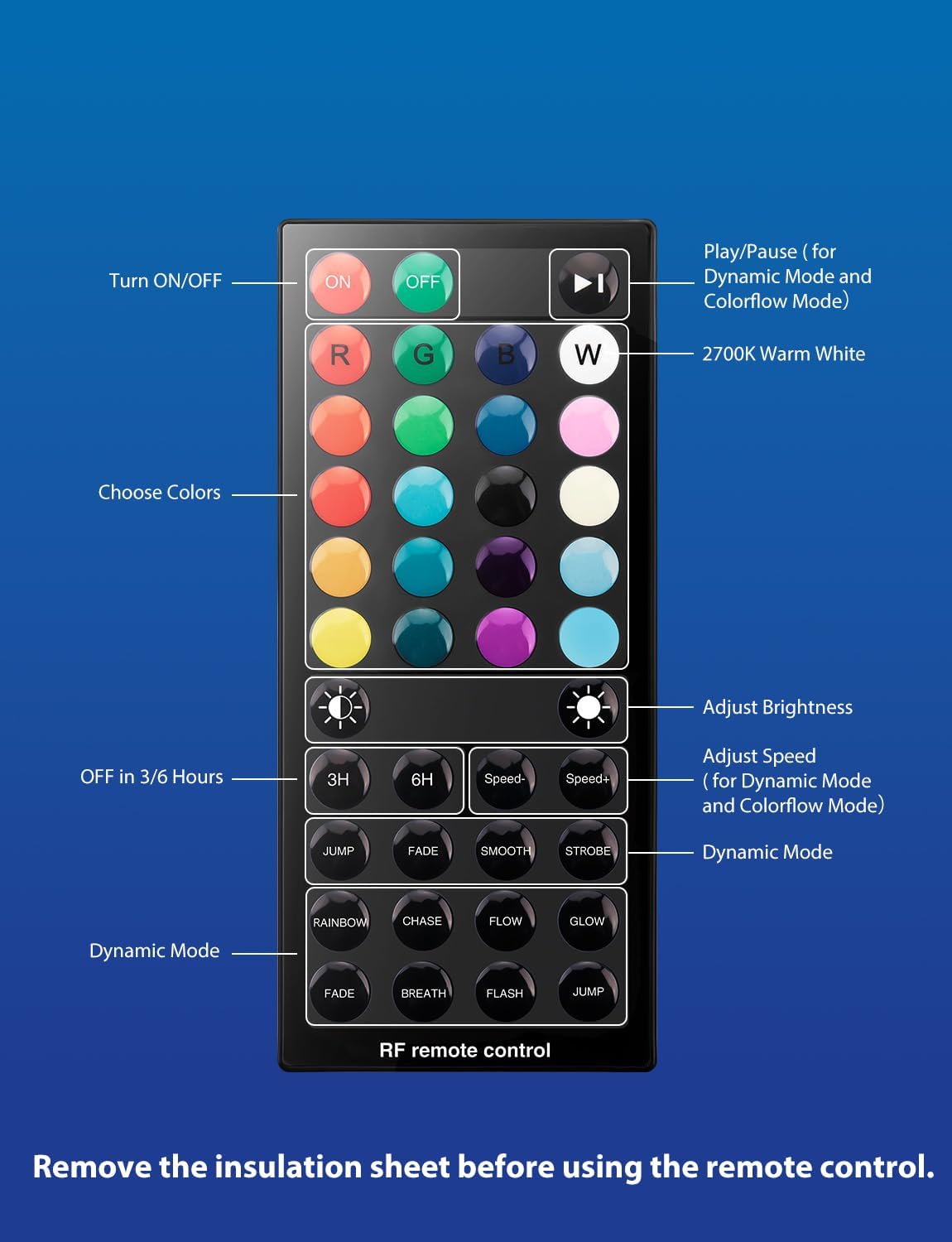 HOW TO PARING: Long-press “ON” button for 3-5s, the light flashes twice quickly, which means pairing is successful. (Note : If colors are different, press any color button to sync)