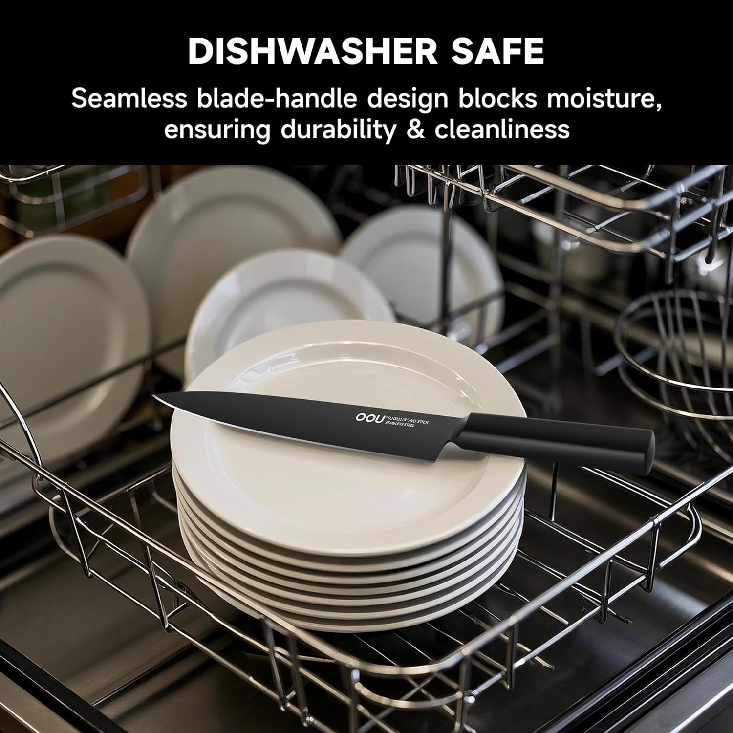 EFFORTLESS DISHWASHER SAFE CLEANING: Designed for modern kitchens, every knife in this set is fully dishwasher safe. The seamless handle minimizes food residue buildup, making cleanup quick and hassle-free—perfect for busy lifestyles.
