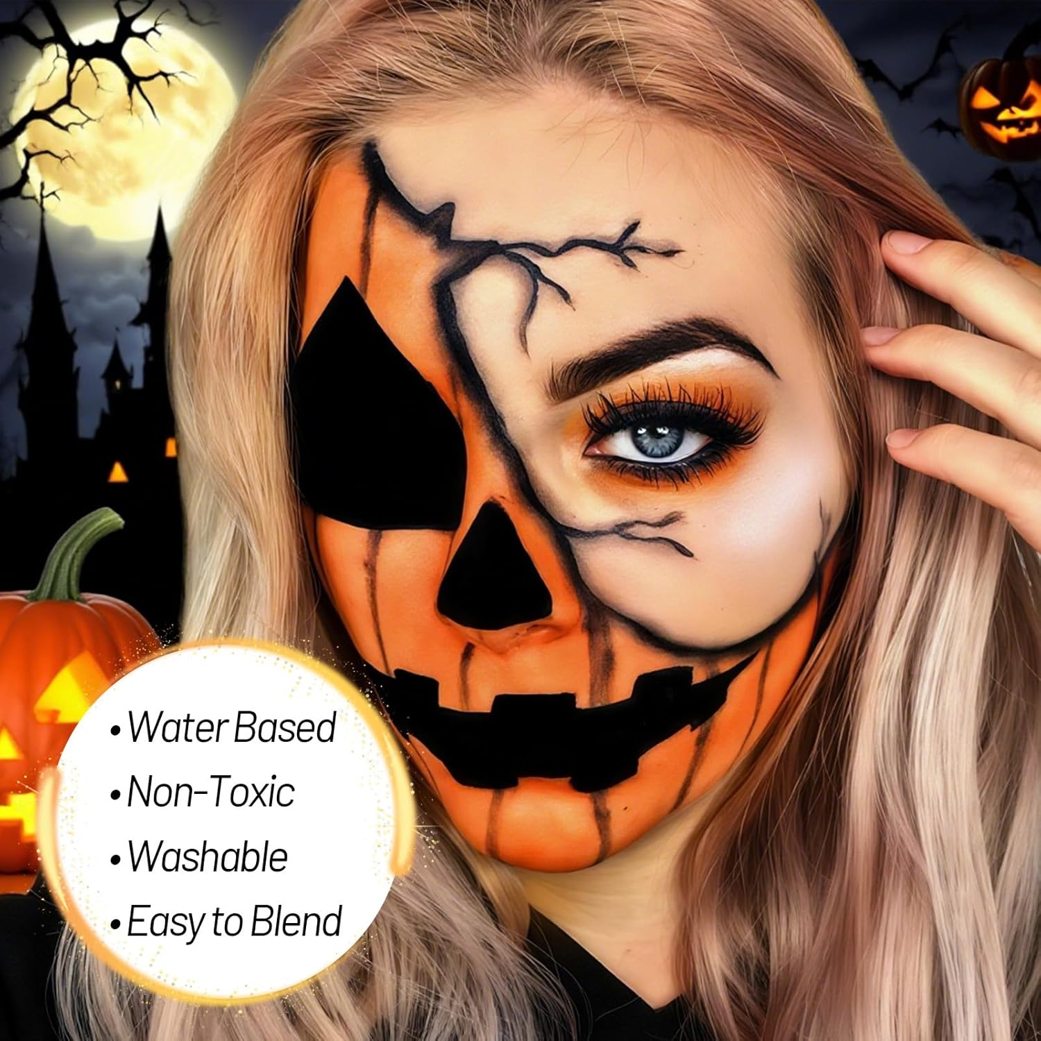 [Creative and Diverse Looks ] This face and body painting can create a variety of makeup looks, such as skull, clown, devil, vampire, Spider-Man, Avatar, Smurf, Zombie bride, mermaid, monster, Witch, Sally, Clown, zombie, Fiona, Shrek, Hulk, Witch, Ferty, Camora, Beast Boy and other character makeup looks. It can also create gothic makeup, degree, pumpkin makeup, etc. A series of makeup looks including sports event makeup, national flag makeup, enigmatic makeup, and SFX special effects makeup