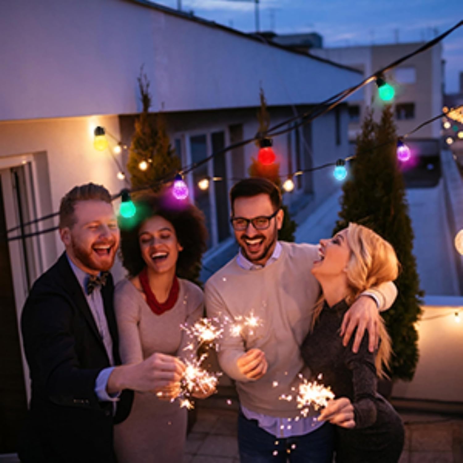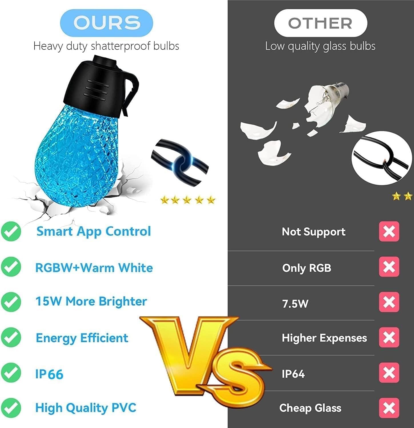 outdoor string lights are the perfect ambient lights with remarkable versatility and vibrant colors. Make your house stand out all year. These LED bulbs are IP66 waterproof and shatterproof, which are reliable and sturdy for outdoor use. ATTENTION: Please keep the power adapter dry because they are NOT weatherproof! Suitable for the fence, front porch, deck, balcony, patio, backyard, children’s room, gaming room, campground. Great for Home Decoration, Ambient Lighting, different holidays, parties, and any event or occasion you can think of.
