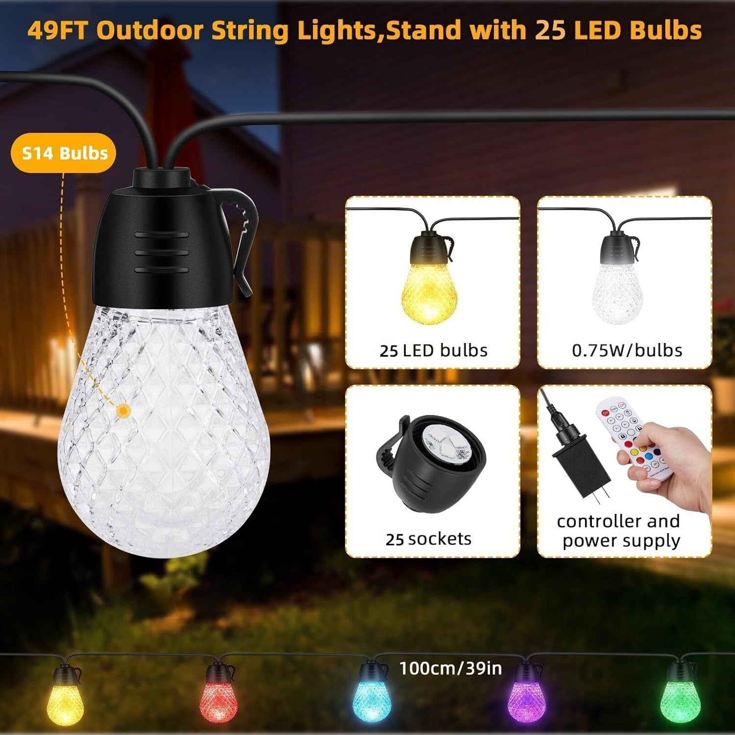 🔋【Energy Saving Led String Lights】: 49FT Outdoor Lights for Patio have 25 premium LED bulbs, providing brighter illumination than traditional incandescent lights. With a lifespan of over 25000+ hours, our patio string lights are designed to last longer, reducing the hassle of frequent bulb replacements. Energy-efficient LEDs consume less electricity, saving on your energy bills.