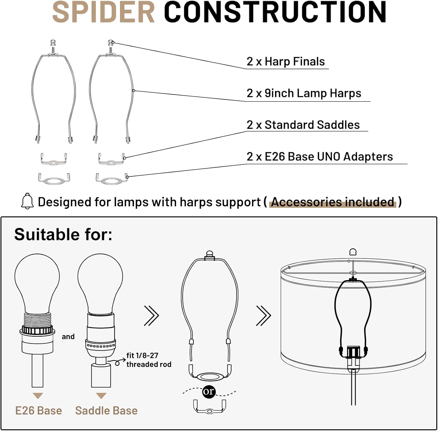 Considerate Lampshade Set: We provide 2 lamp shades, each including a 9-inch lamp shade harp and two kinds of adapters that are compatible with both Saddle base and E26 Base light fixtures. Choose the standard Saddle adapter or the E26 base Uno adapter, easily customizing the fabric replacement lamp shade for a perfect fit with your specific lamp type