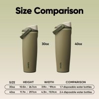 40-ounce insulated stainless steel water bottle with extra features: includes a 2-in-1 spout that lets you choose how you drink; push-button, leak-proof lid that locks for all your adventures