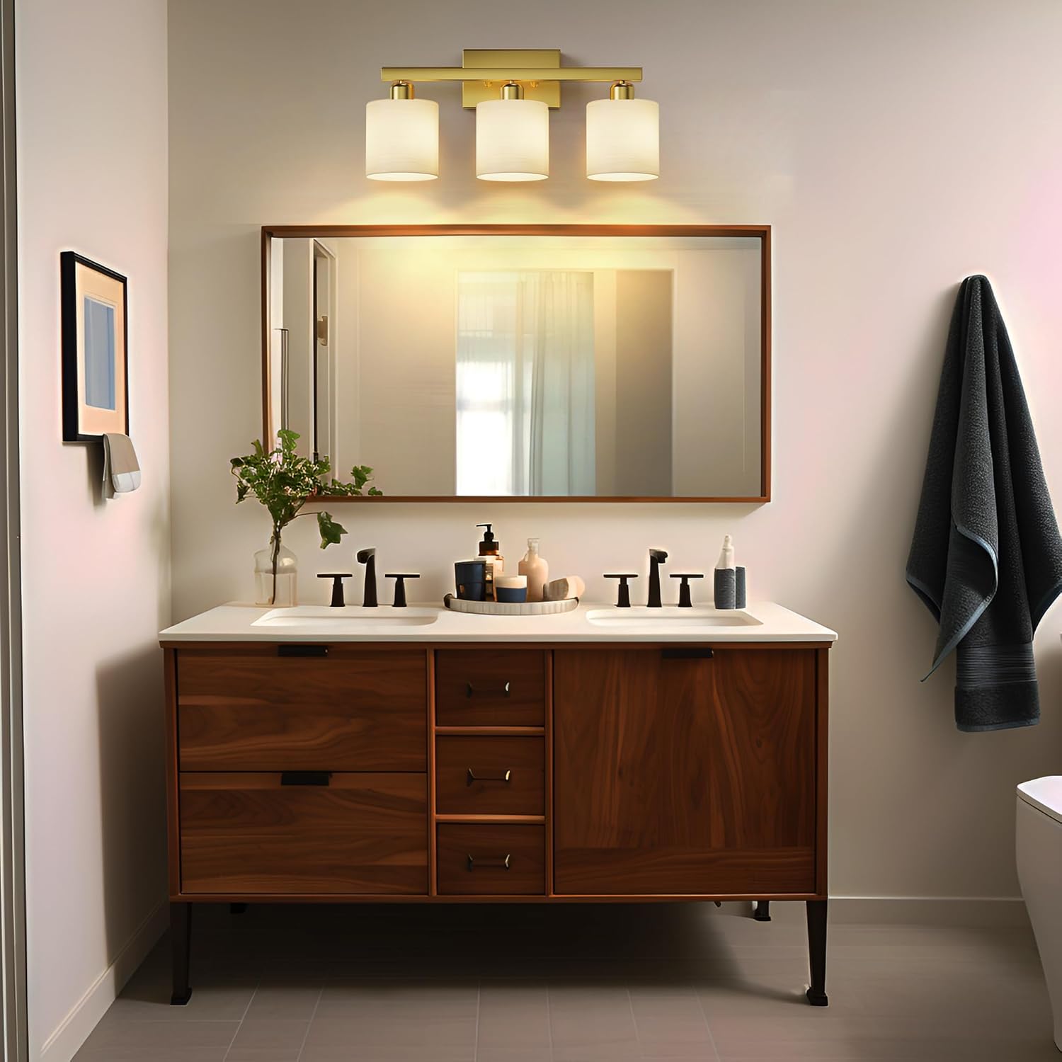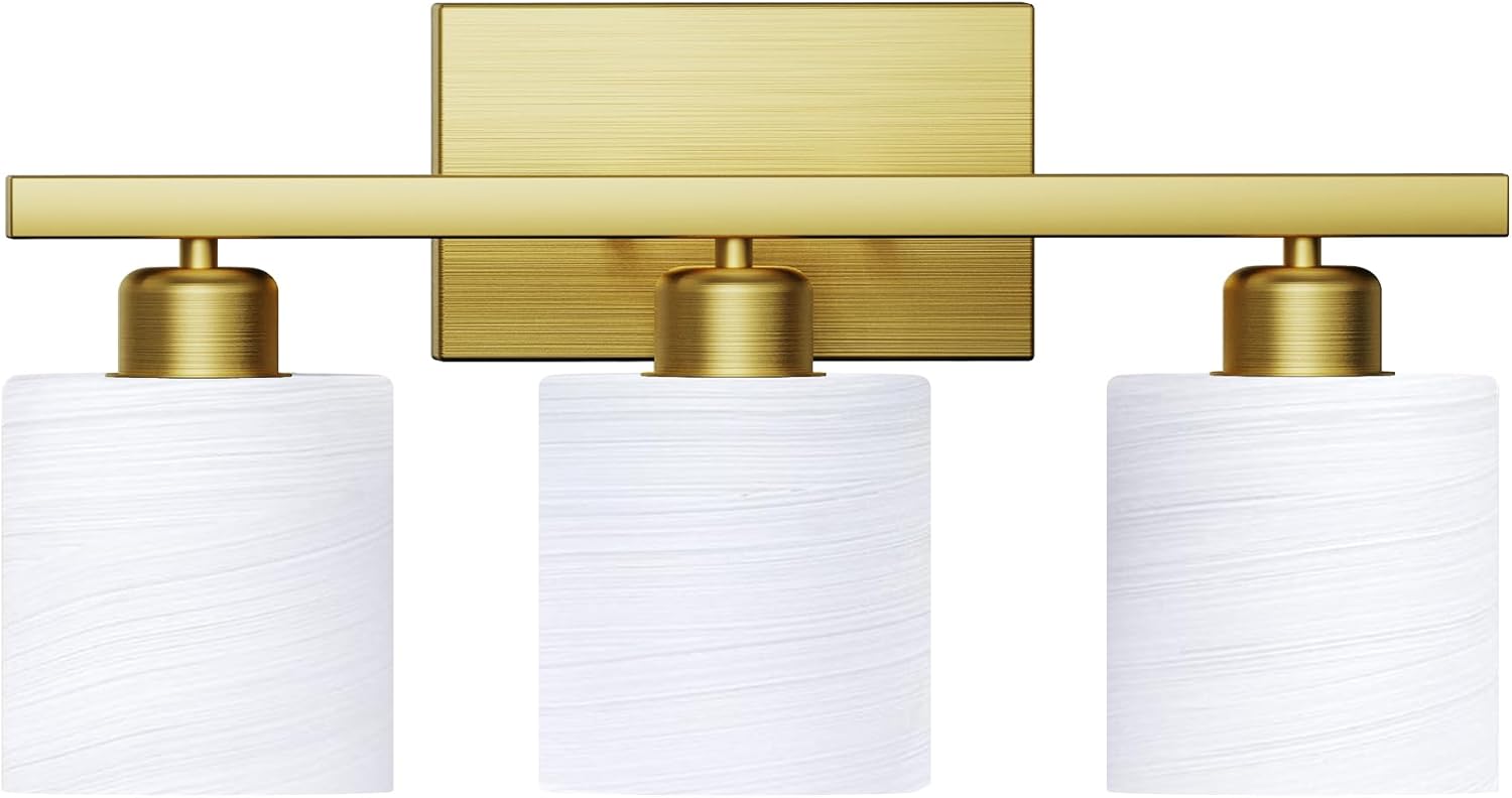 Modern lighting design: mingle function design with sophisticated style with PARTPHONER bath vanity light. Featuring a stylish golden finish and textured white cylindrical glass shades, this bath lighting collection adds a pleasing touch of elegance to your home. Ideal for any bathroom in coastal, luxury, modern, and transitional settings
