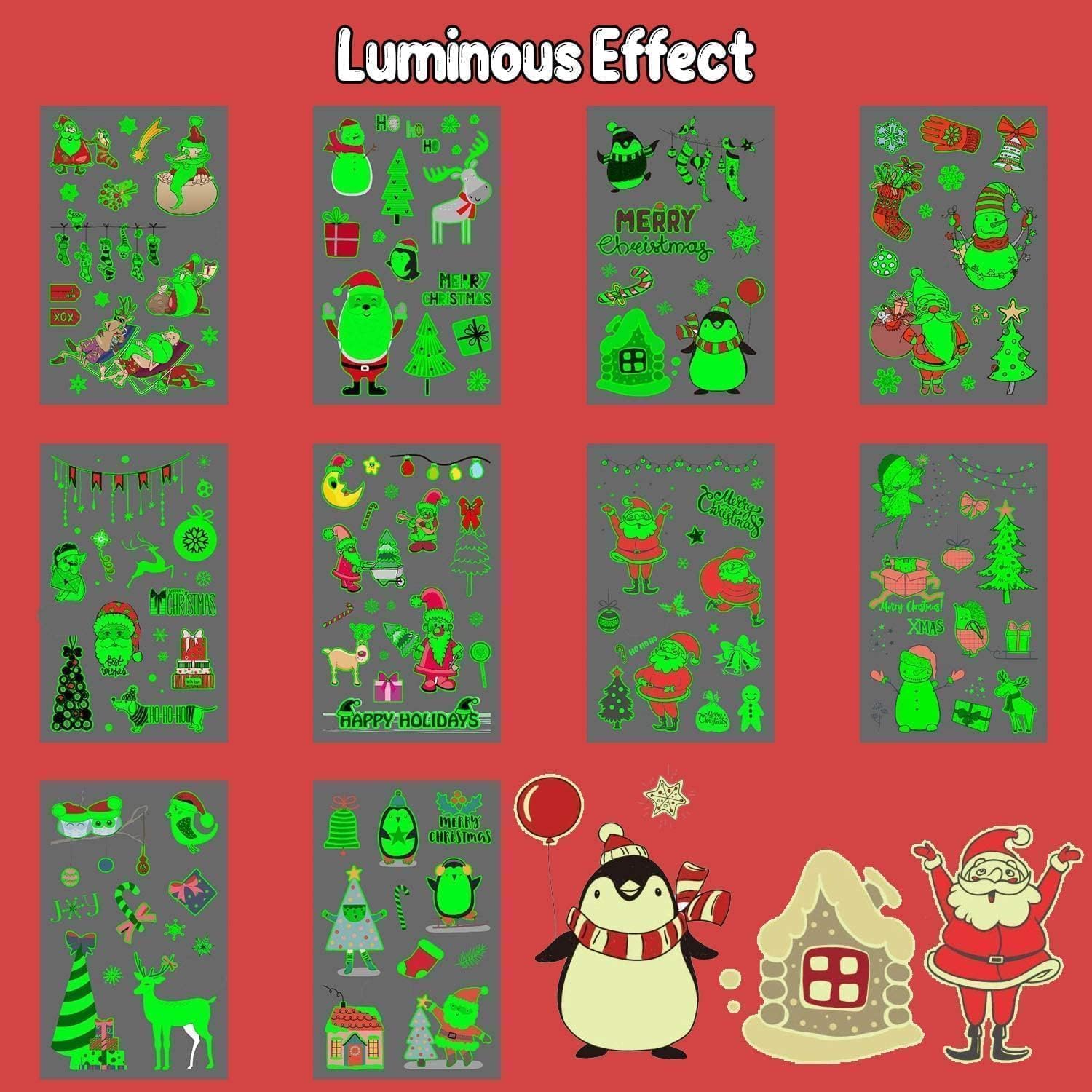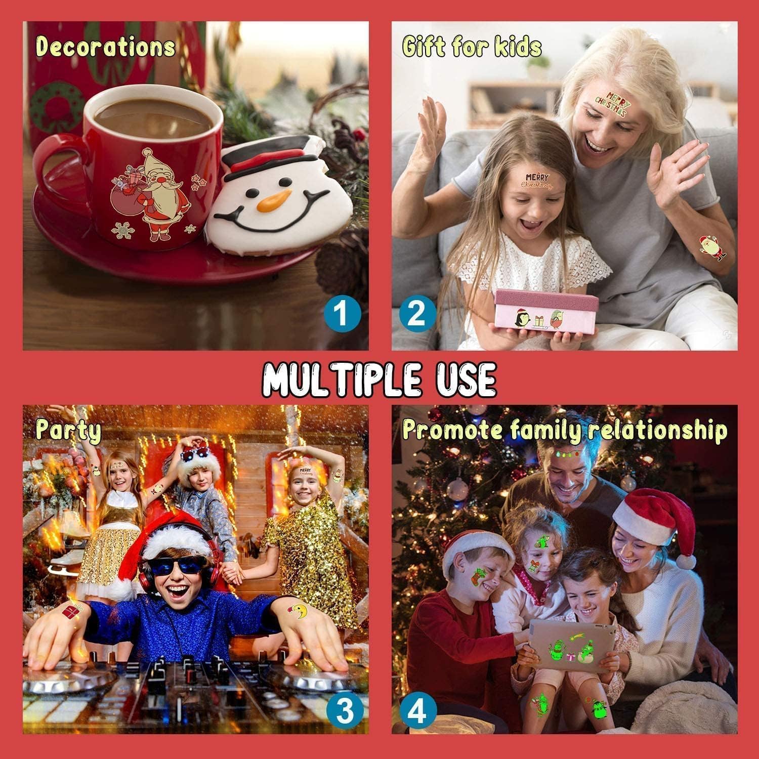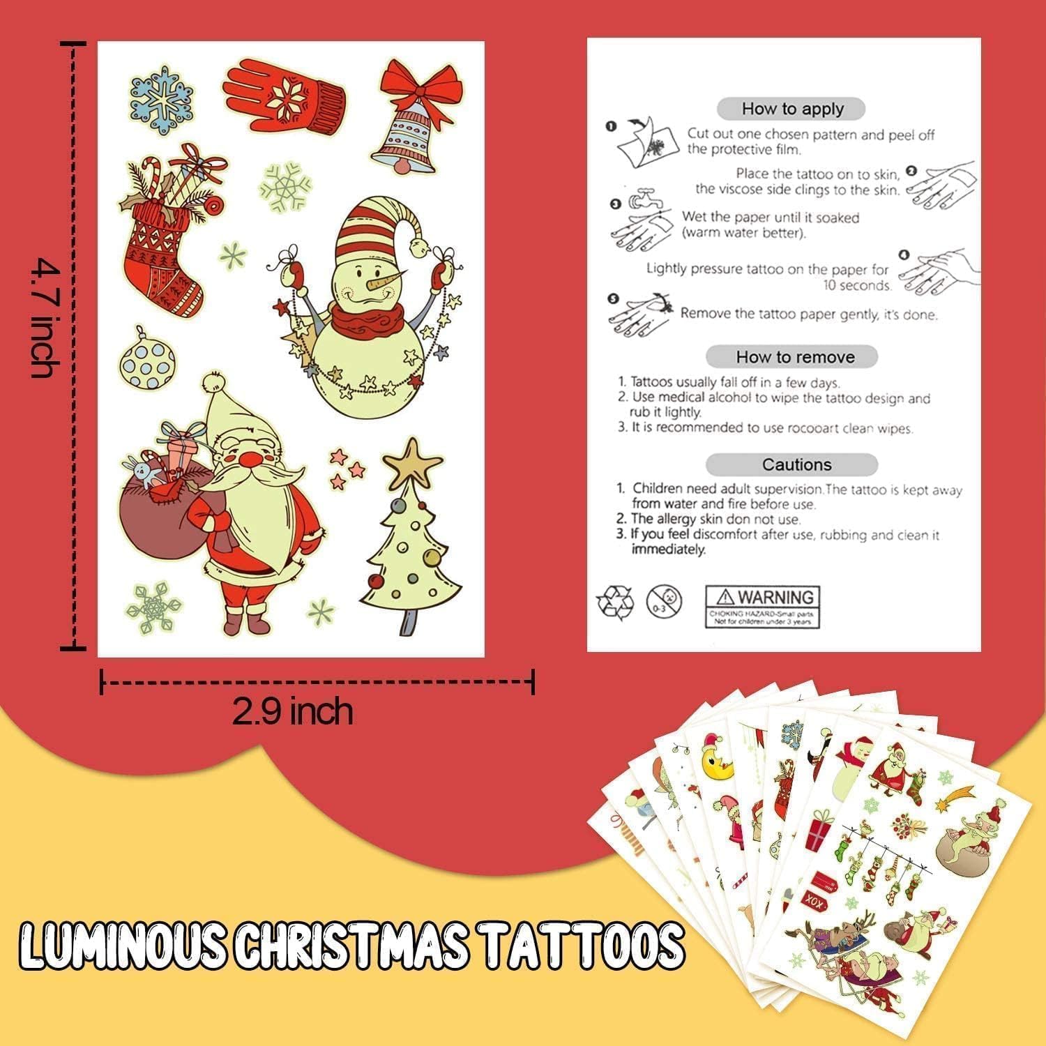 【Luminous Merry Christmas Theme Temporary Tattoos for Kids】Luminous Merry Christmas theme temporary tattoos for kids. Even at a night party with lots of people, these luminous tattoos will make you unique among the crowd! These super cute elements in our Merry Christmas themed fake tattoos include Santa, reindeer, snowmen, Christmas tree, and other Christmas -related patterns!