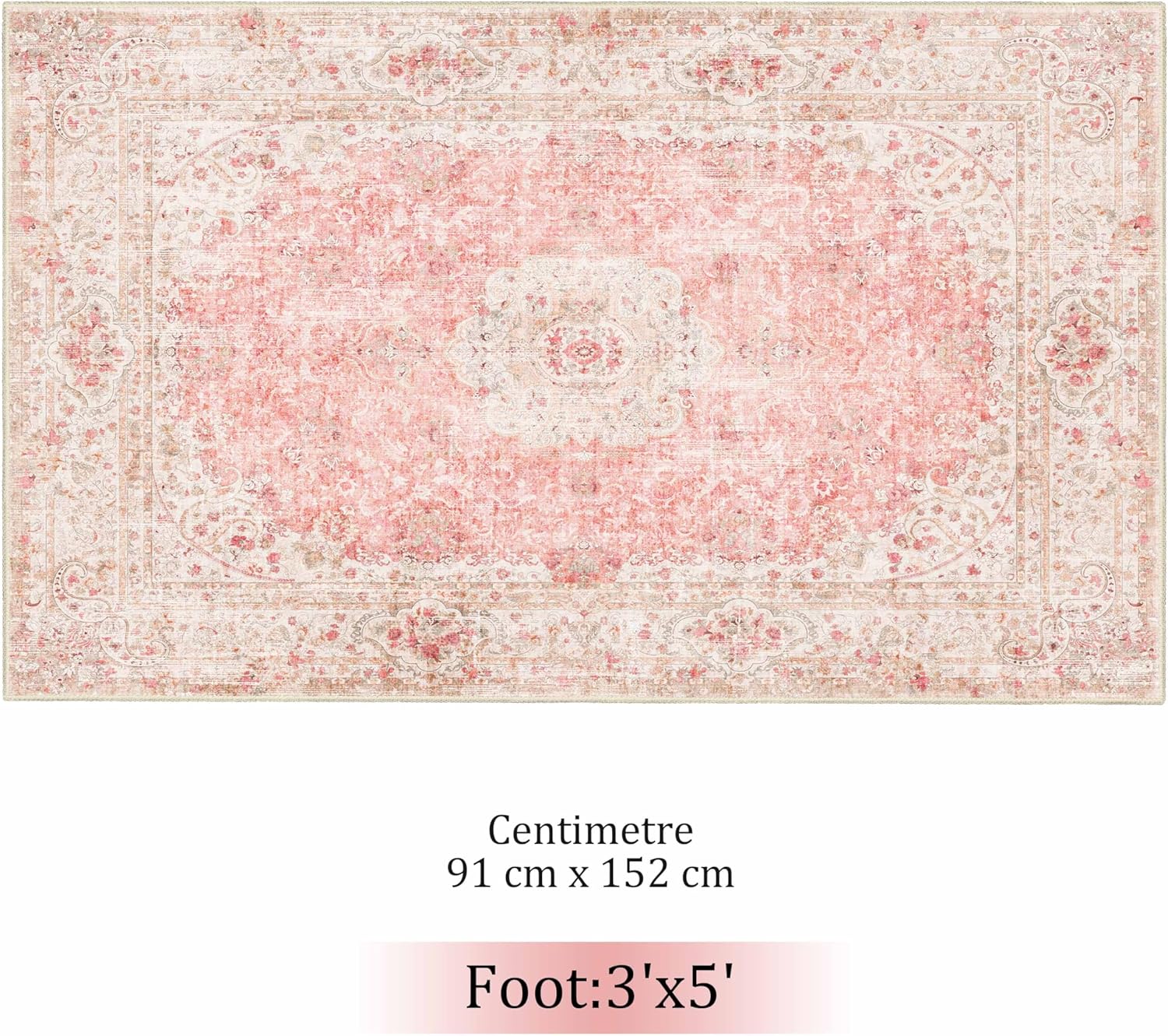 Machine Washable Area Rug: Pink rug 3’x5′ is foldable and its edges are reinforced by stitching.3’x5 ‘rug is machine washable and after washing you can dry it in a low temperature or air dry it. Blush pink rug will not fade, can be used many times. Note: Do not use bleach to clean.
