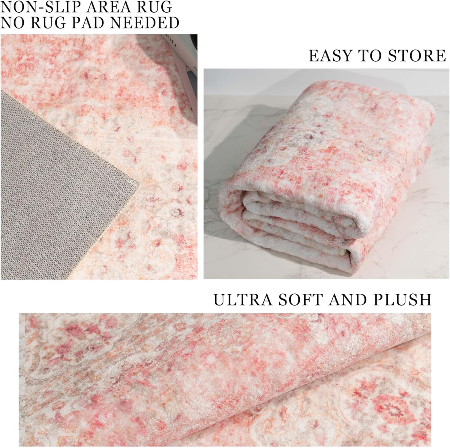 Non-slip Area Rug: Boho rug 3’x5’ has good non-slip effect and does not require the extra use of non-slip backing. Washable Rug 3’x5’ can be trusted to use, will not bring scratches or damage to the floor . The elderly can also play and walk on this blush pink rug.