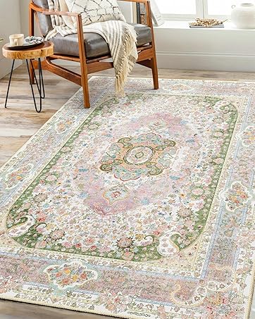 Castage Boho Rug,Washable Area Rugs for Bedroom Living Room Kitchen Entryway,Small Vintage Distressed Non Slip Carpet,Pink Green