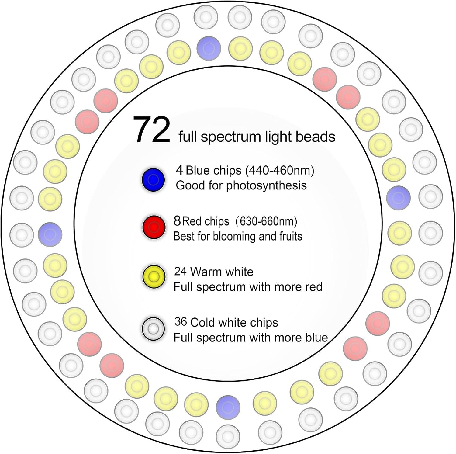 72 LED Grow Light Full Spectrum – Compact grow light with high quality super bright LEDs, offer full spectrum 380nm-800nm, including white5000K/36 LEDS,warm white 3000K/28 LEDS,red/6 LEDS,blue2 LEDS to effectively promote indoor plant growth any time of year, beneficial to entire growth period.