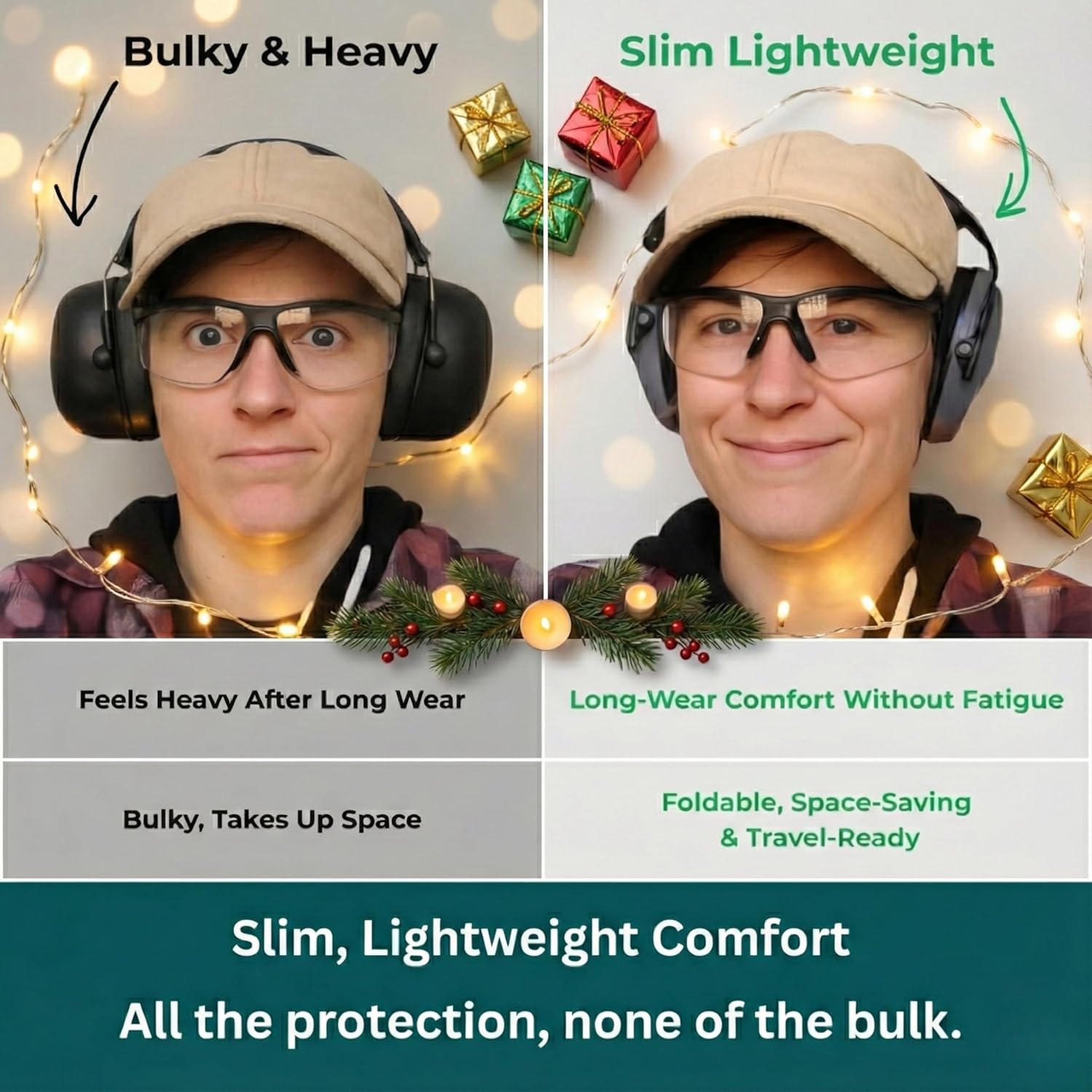 34 dB NRR — Proven, Compact & Trusted for Over 10 Years: Since 2013, we’ve designed sleeker, lighter safety earmuffs without sacrificing performance — launching one of the first models certified at 34dB NRR, a rare achievement for compact soundproof earmuffs. Most ear muffs above 30 dB are bulky and heavy; ours deliver powerful noise protection with lasting comfort, fold to pocket size, and give you the confidence to take on shooting ranges, hunting, yard work, and any loud environment