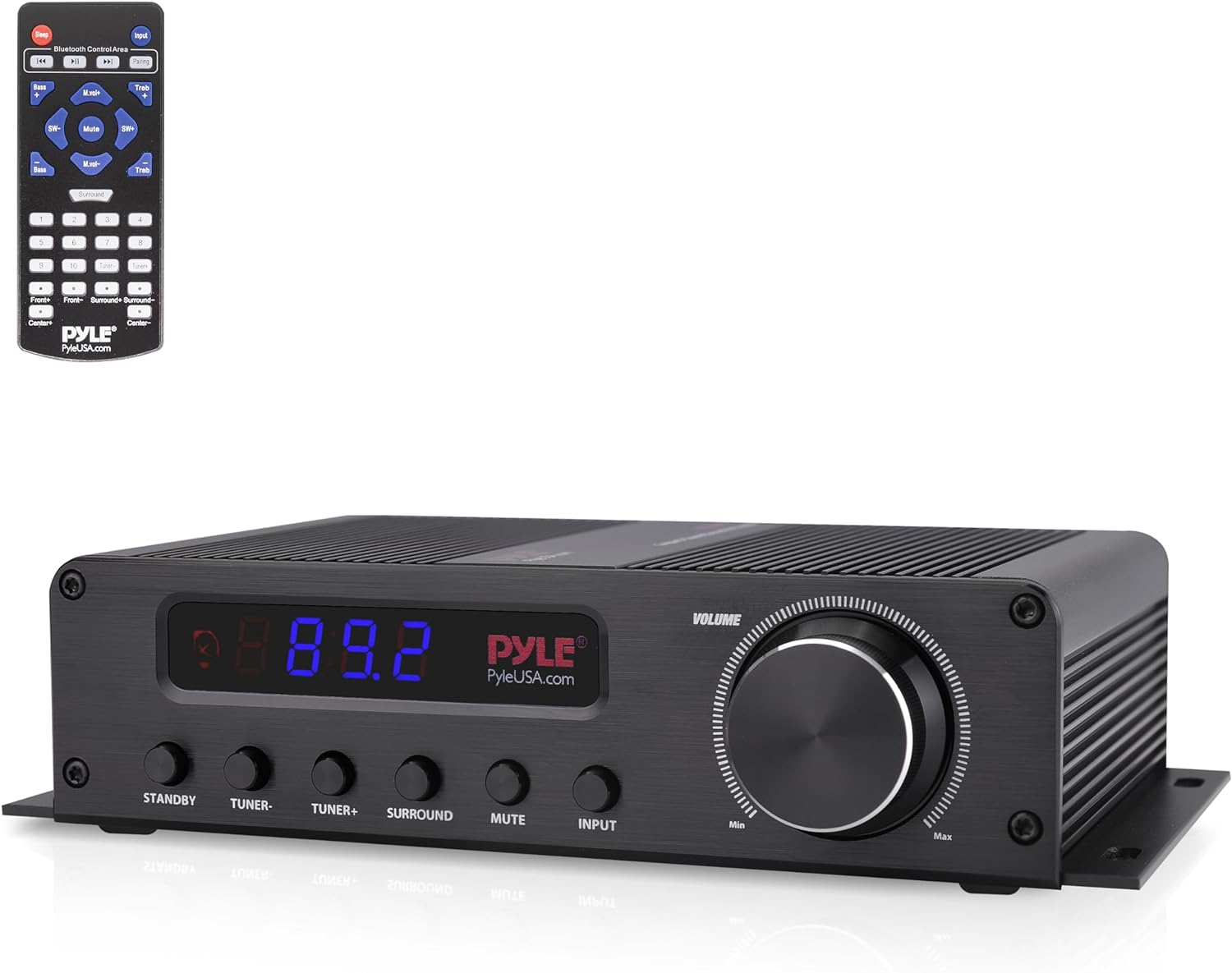 Features: – 5.1 Channel Powered Amp Design – Lightweight & Compact Size – Hassle-Free Bluetooth – Wireless Music Streaming Receiver-Free Connection – FM Radio with Digital LED Display – Front Panel Button Control Center – HDMI Output + (2) HDMI Inputs – Spring Loaded Speaker Terminal Connectors – Full Range Stereo Sound Reproduction – RCA Subwoofer Output – Includes Remote Control Bluetooth Connectivity: – Built-in Wireless Music Streaming Receiver – Compatible with All of Your Favorite Bluetooth Devices – Smartphones, Tablets, Computers, Laptops, etc. – Bluetooth Version: 4.0 – Bluetooth Network Name: ‘PyleUSA’ What’s in the Box: – Compact Amplifier – Remote Control – 12V Power Adapter Technical Specs: – Remote Control Battery Operated, Requires (2) x ‘AAA’ Batteries – Battery Type: 14.8V Lithium-ion 1500mAh – Power Output: 100 Watt MAX (5x20W) – HDMI 2160p Support – Bluetooth Protocol Support: AVRCP V1.4 – Construction Material: Metal, Aluminum Alloy – Power: 110/220V (12V Power Adapter) – Dimensions: 8.0’’ x 5.8’’ x 2.0’’ -inches