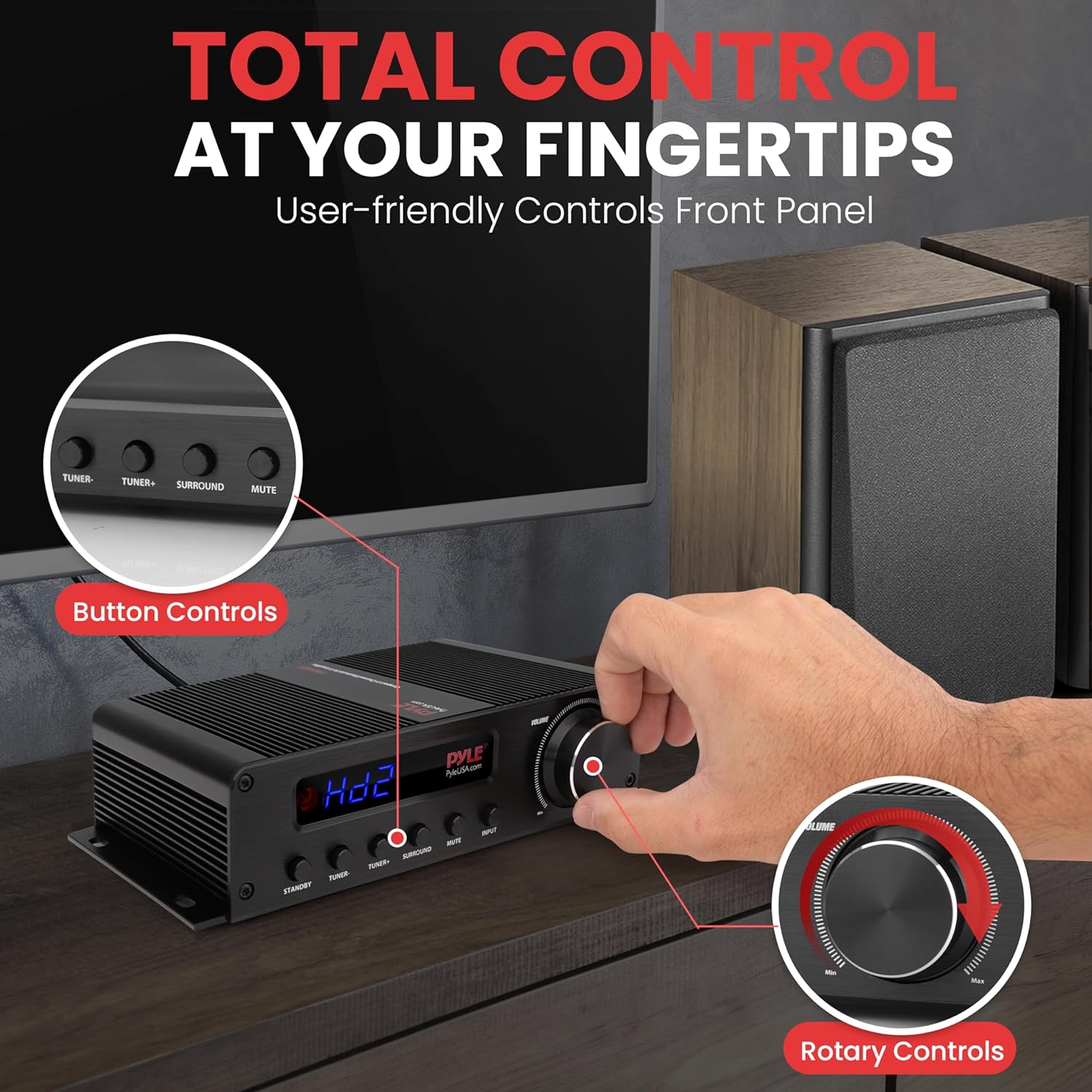EQ CONTROLS: This multi purpose 5-channel compact home theater digital stereo receiver box features crisp buttons and rotary knob controls for audio adjustment. Includes 12V adapter and remote control for easy distant audio adjustments