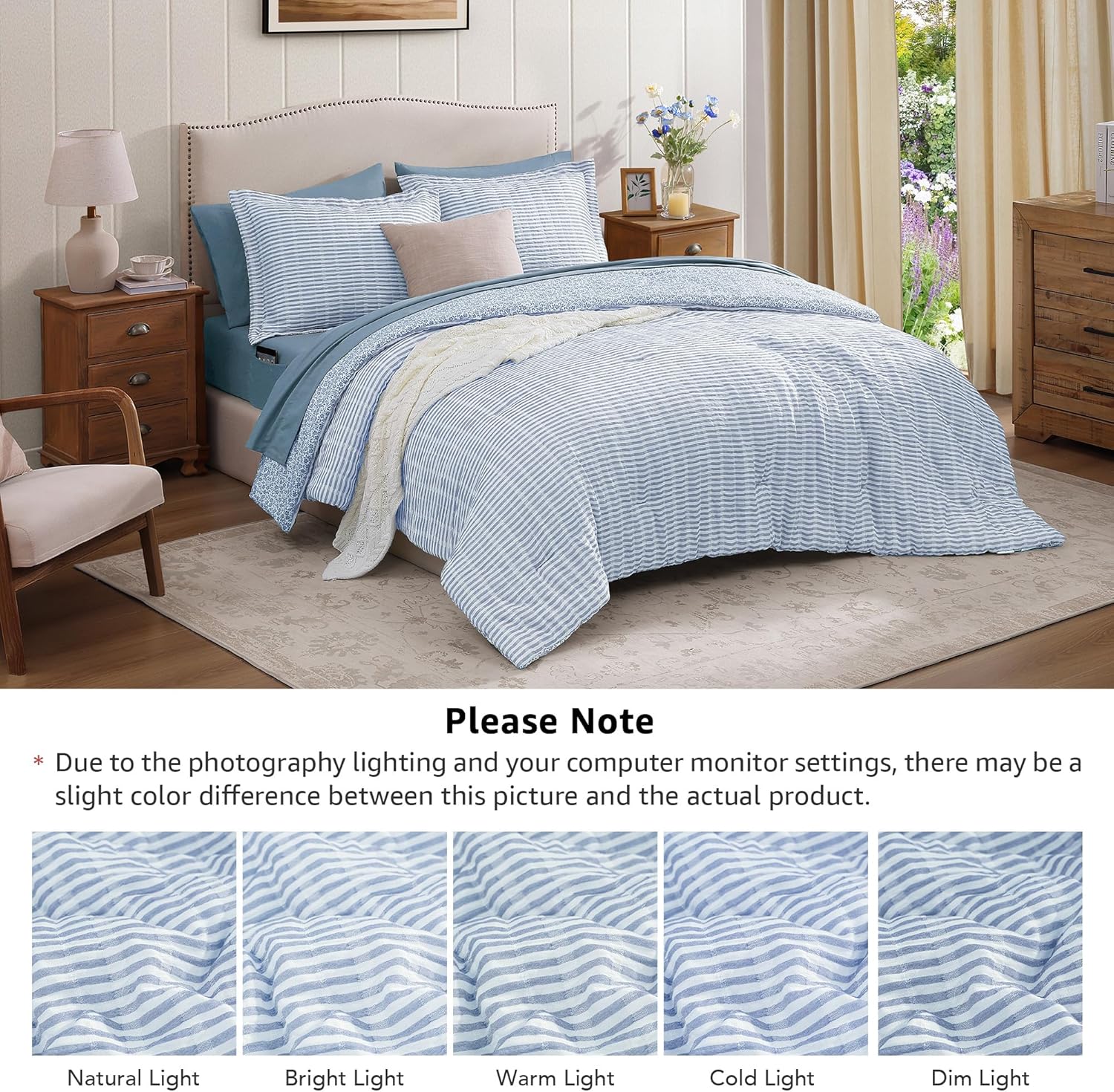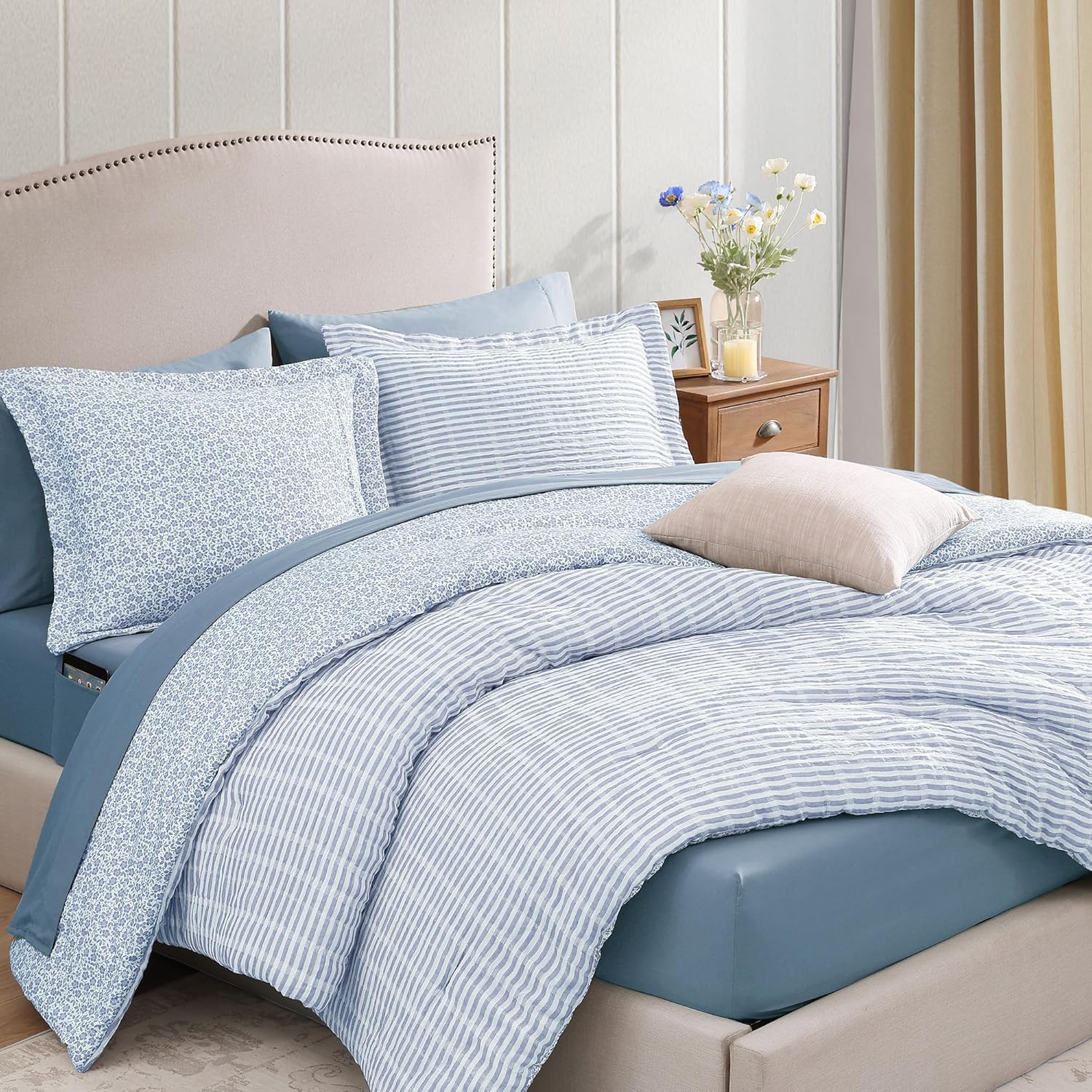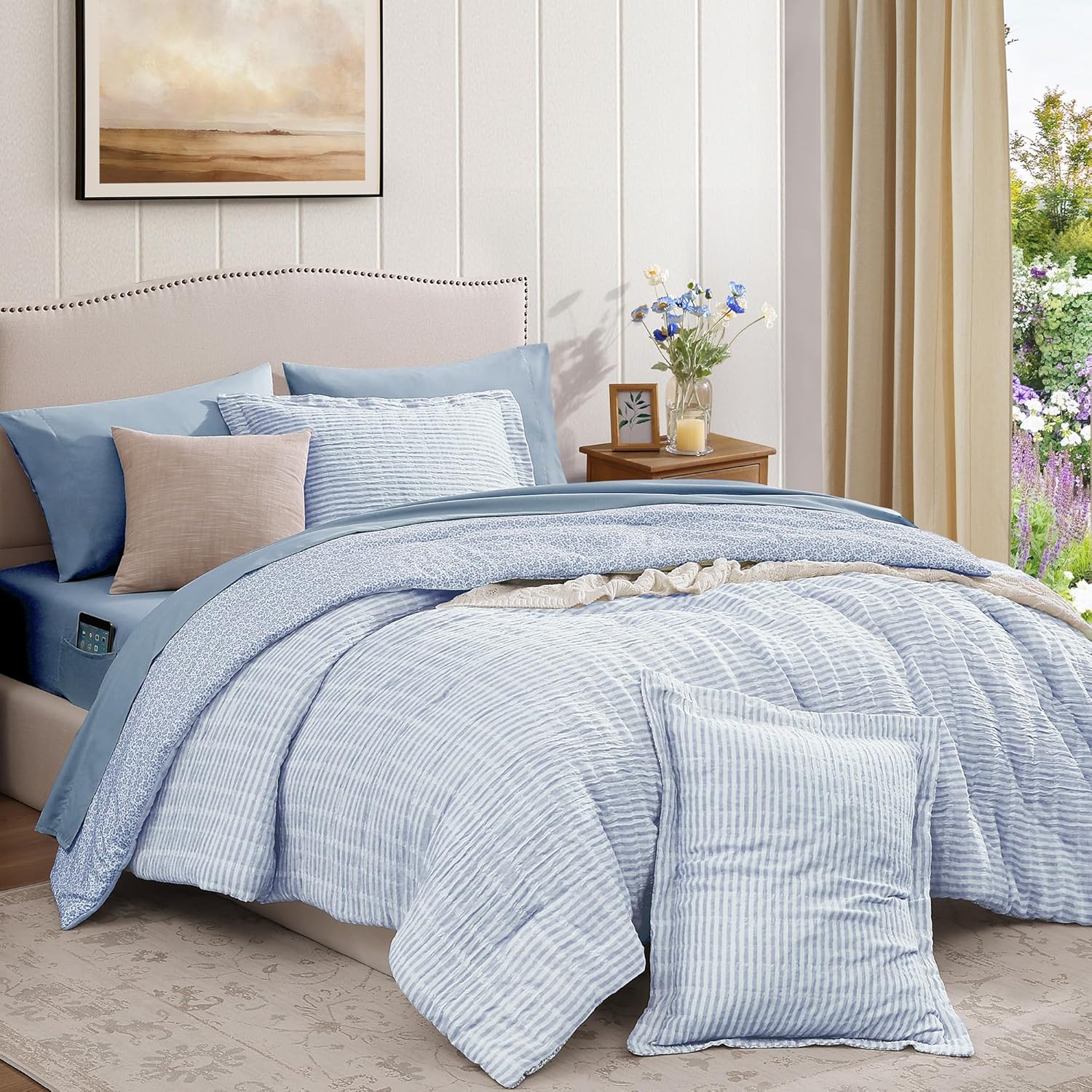Queen Comforter Set – 7 Pieces Blue Gauze Muslin Bedding Sets for All Seasons, Lightweight Breathable Bed in a Bag Queen with Revesible Farmhouse Comforter, Sheets, Pillowcases & Shams