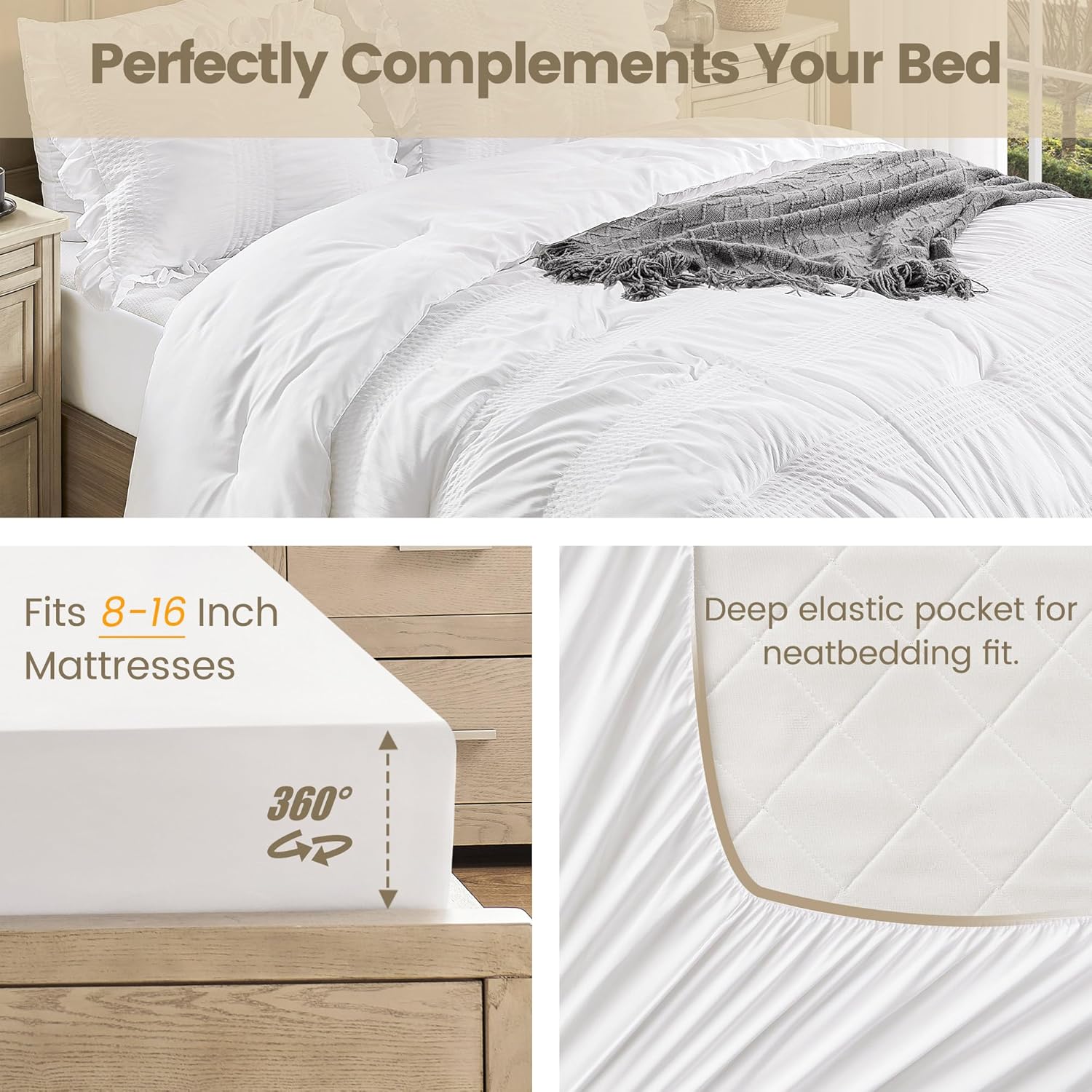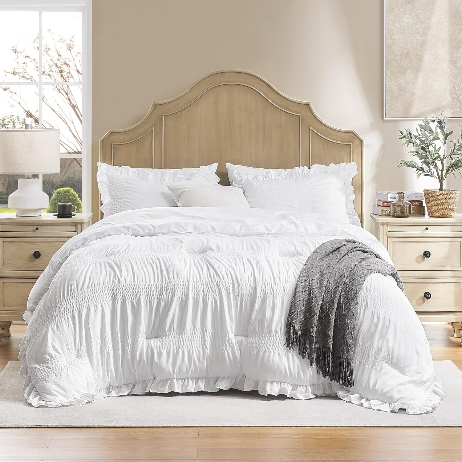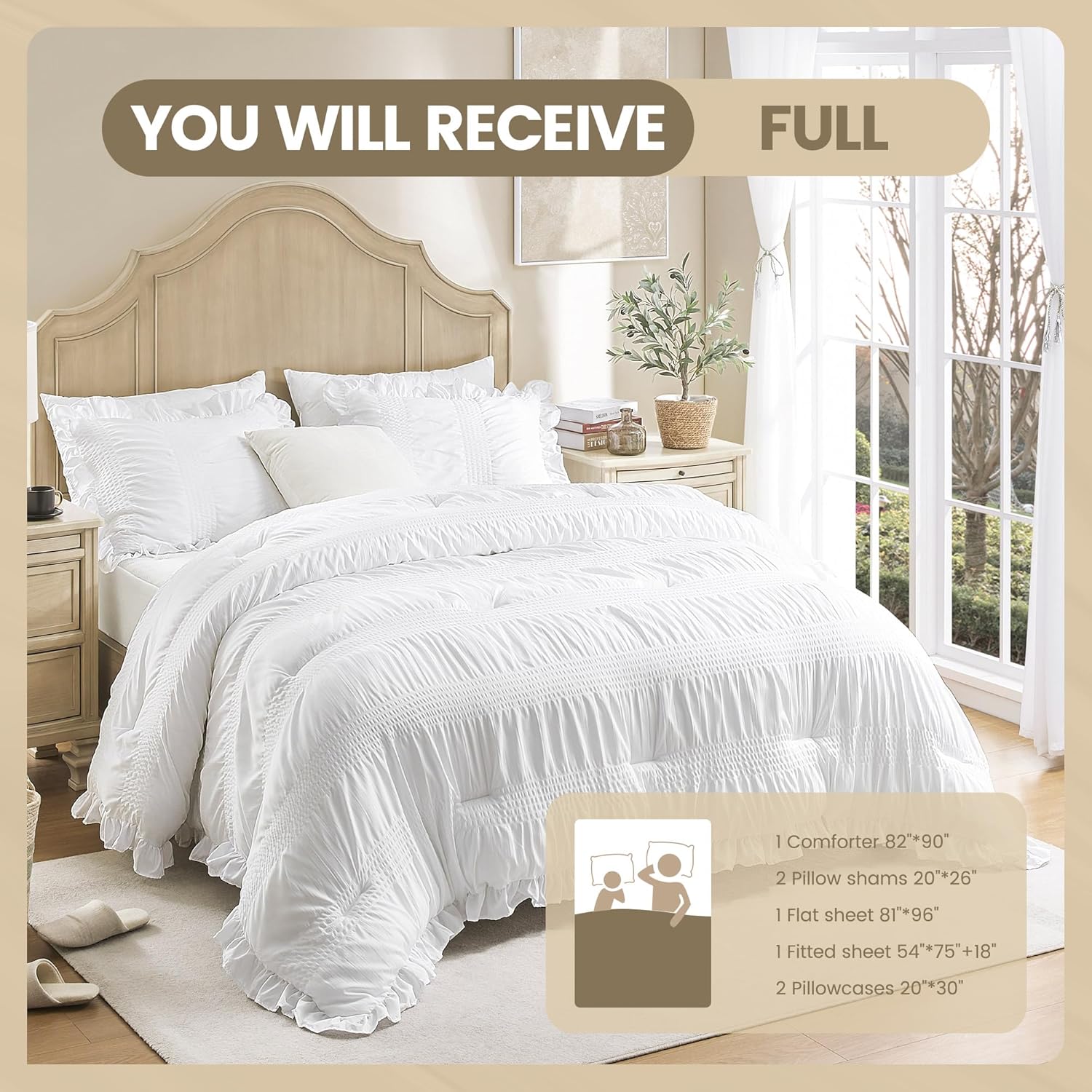 QUIETSEA Full Comforter Set Seersucker 7 Pieces Luxury Ruffle Bed in a Bag Full Size for All Season White Bedding Set with Comforter, Pillowcases, Flat Sheet, Fitted Sheet and Pillow Shams