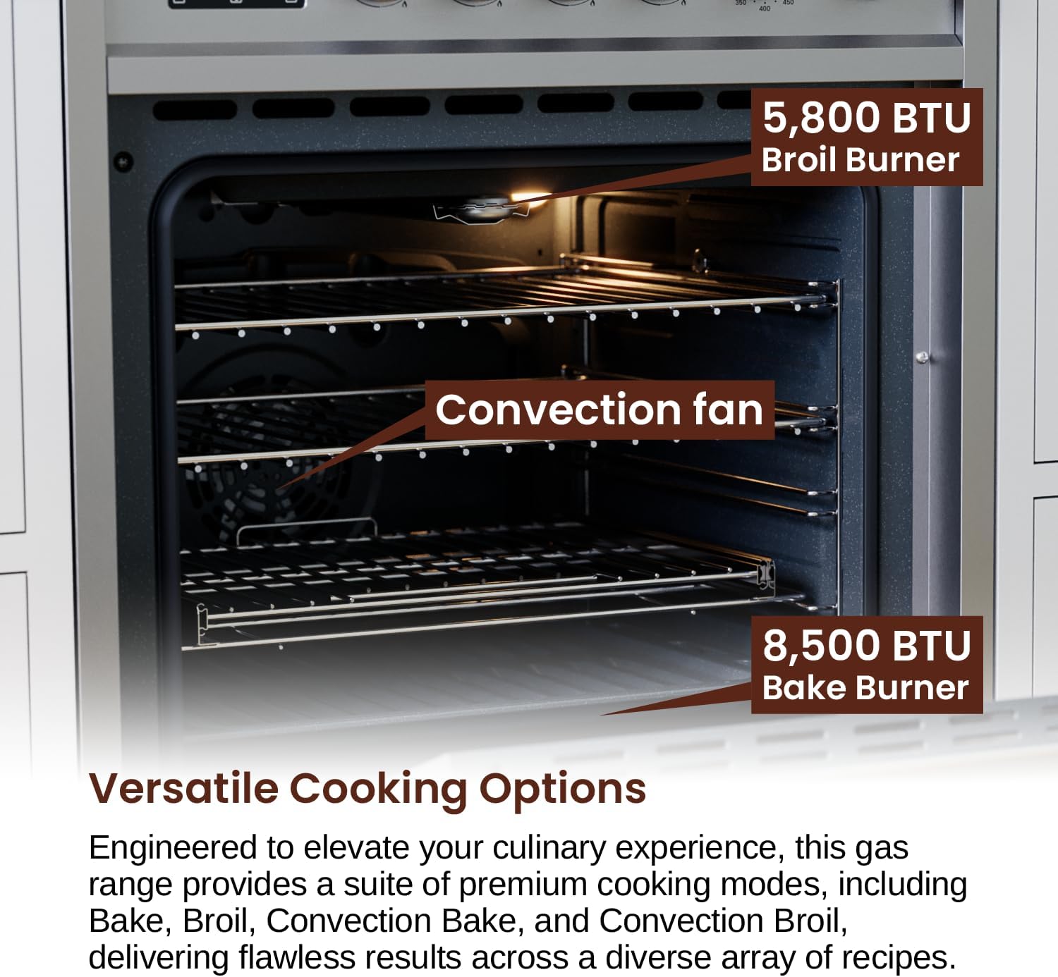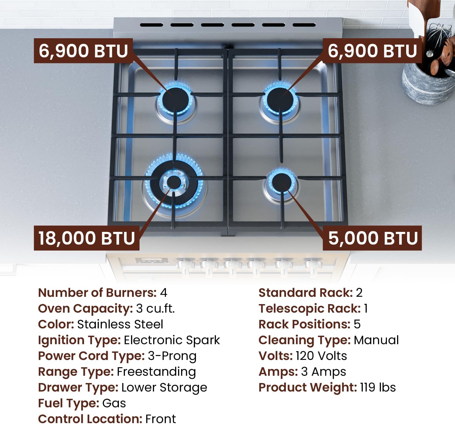 Customers find the gas range to be of good quality and appreciate its nice aesthetics, perfect size, and simple operation. Moreover, the oven performs well, and customers find the installation process easy. Additionally, the range comes with all necessary parts, including an LP conversion kit. However, customers disagree on the noise level.