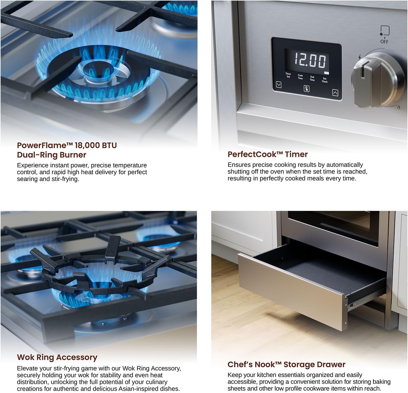 POWERFLAME 18,000 BTU DUAL-RING BURNER: For instant power, our PowerFlame Dual-Ring Burner provides precise temperature control and delivers high heat quickly and evenly across the cookware, perfect for searing and stir-frying.