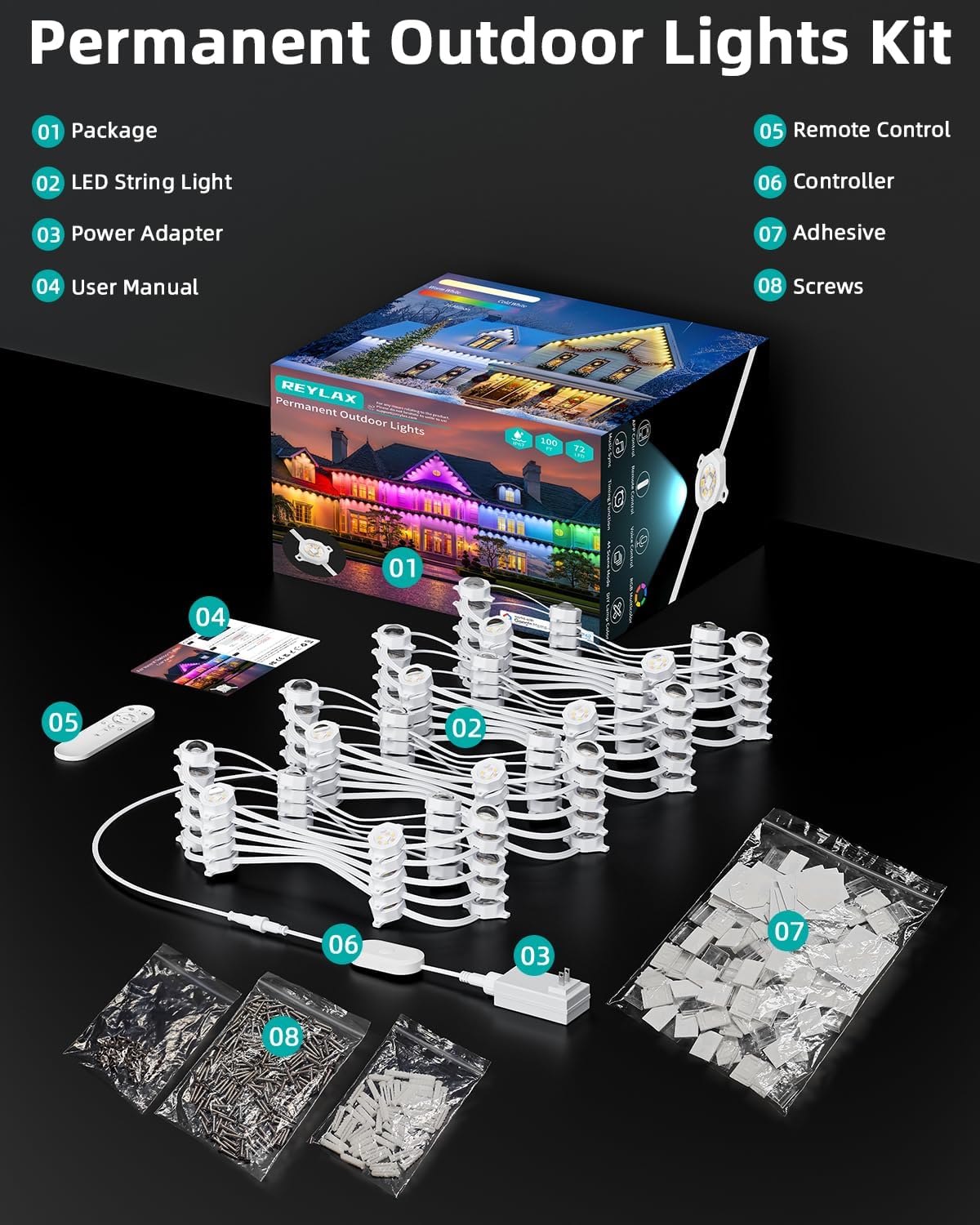 Strong Outdoor Reliability: The permanent string lights feature advanced glue filling technology and have undergone rigorous testing. They are IP67 waterproof, and the IP65 control box allows them to operate stably in severe weather ranging from -22°F to 140°F. They can be used for up to 50,000 hours, so they do not need to be replaced frequently