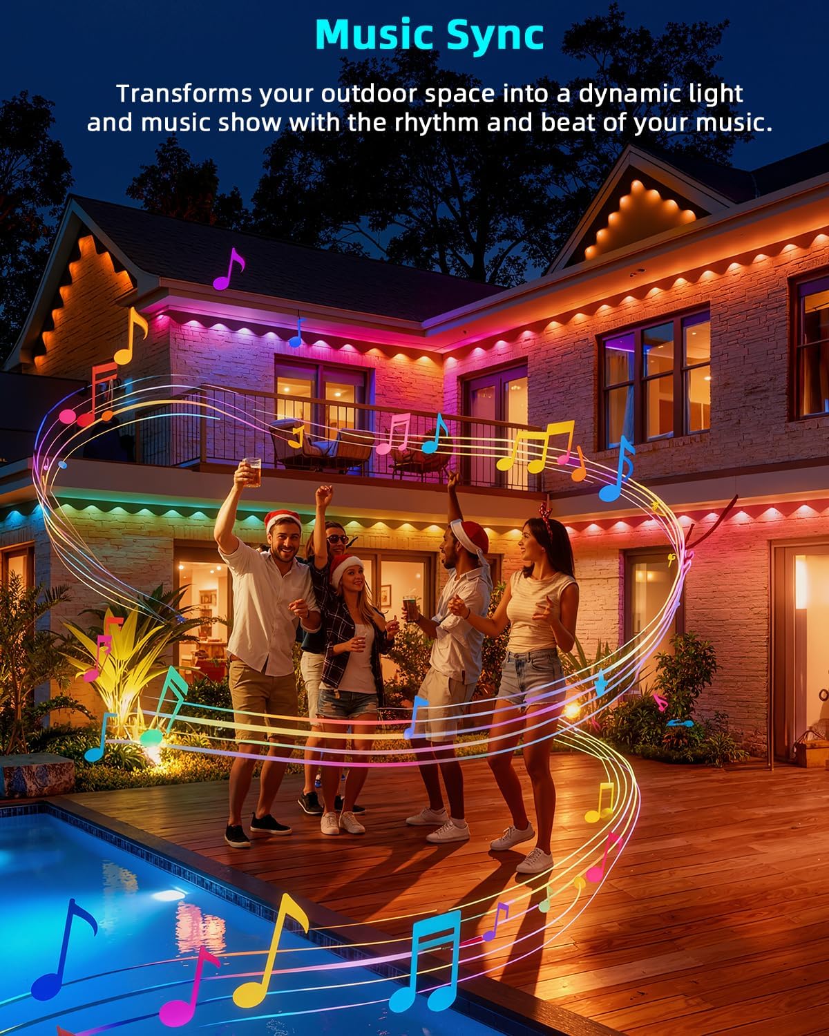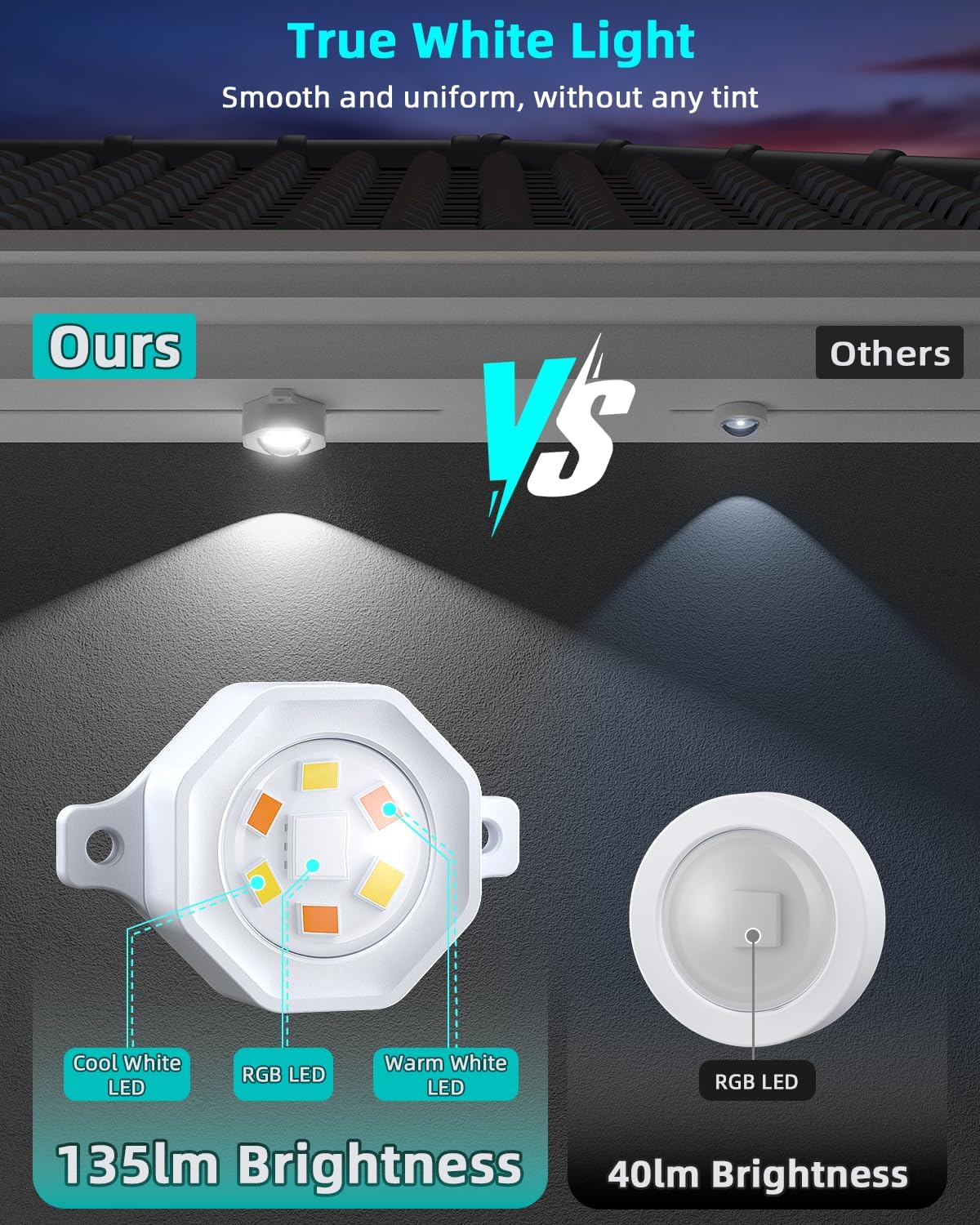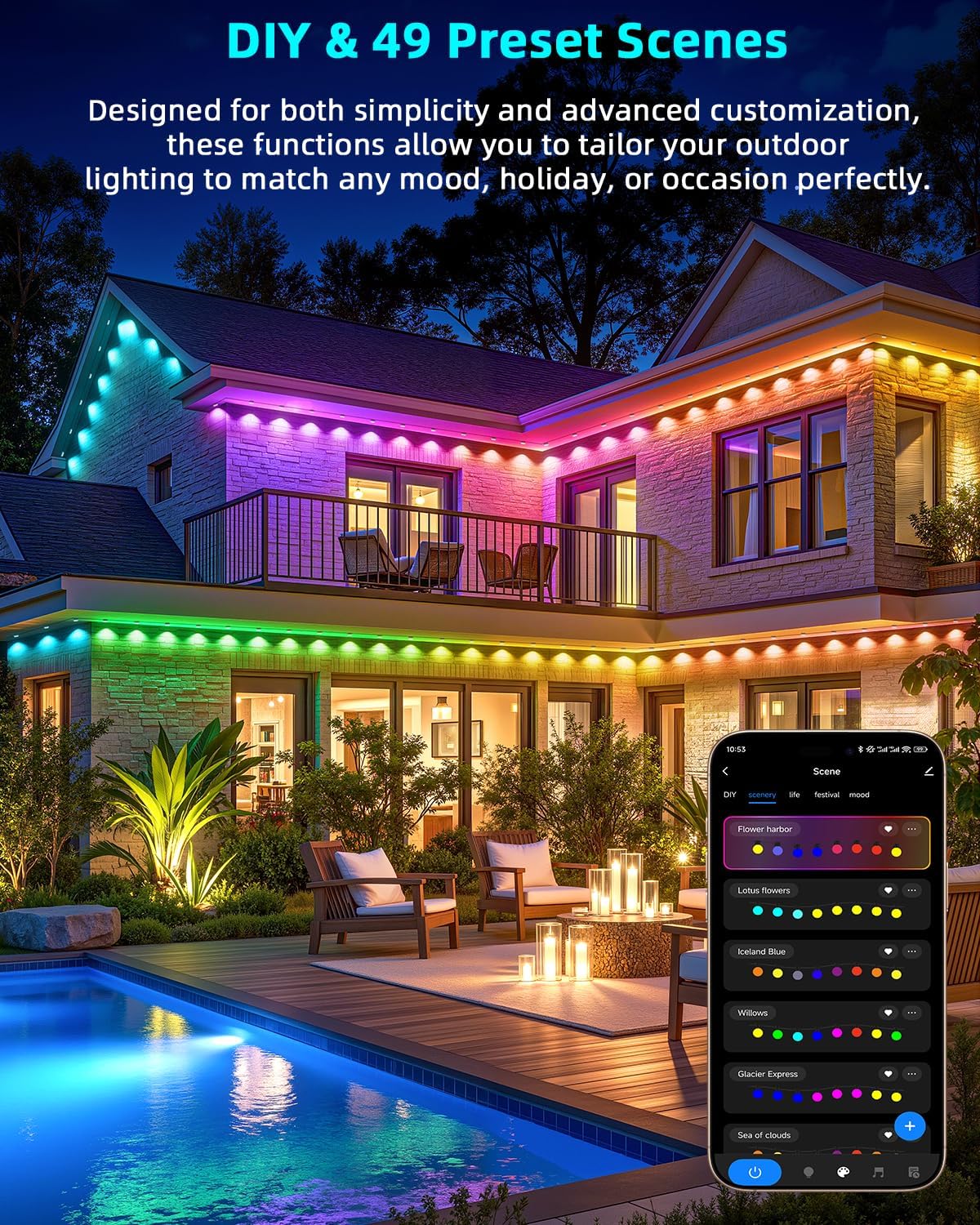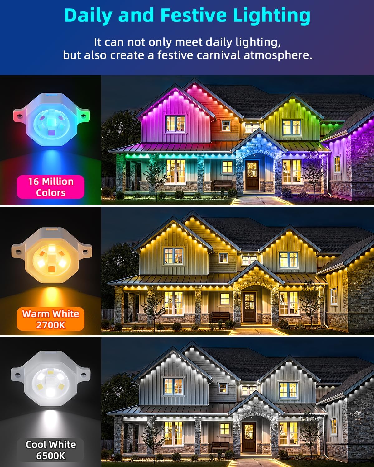 Upgraded RGB+Warm+White LED Beads: The RGBCW permanent outdoor lights have 72 LEDs, each with 7 built-in, high-brightness lamp beads that emit up to 135 lumens. Seamlessly switch between 16 million colors and white light. Whether for a festival, carnival, or daily lighting, these lights can do the job perfectly