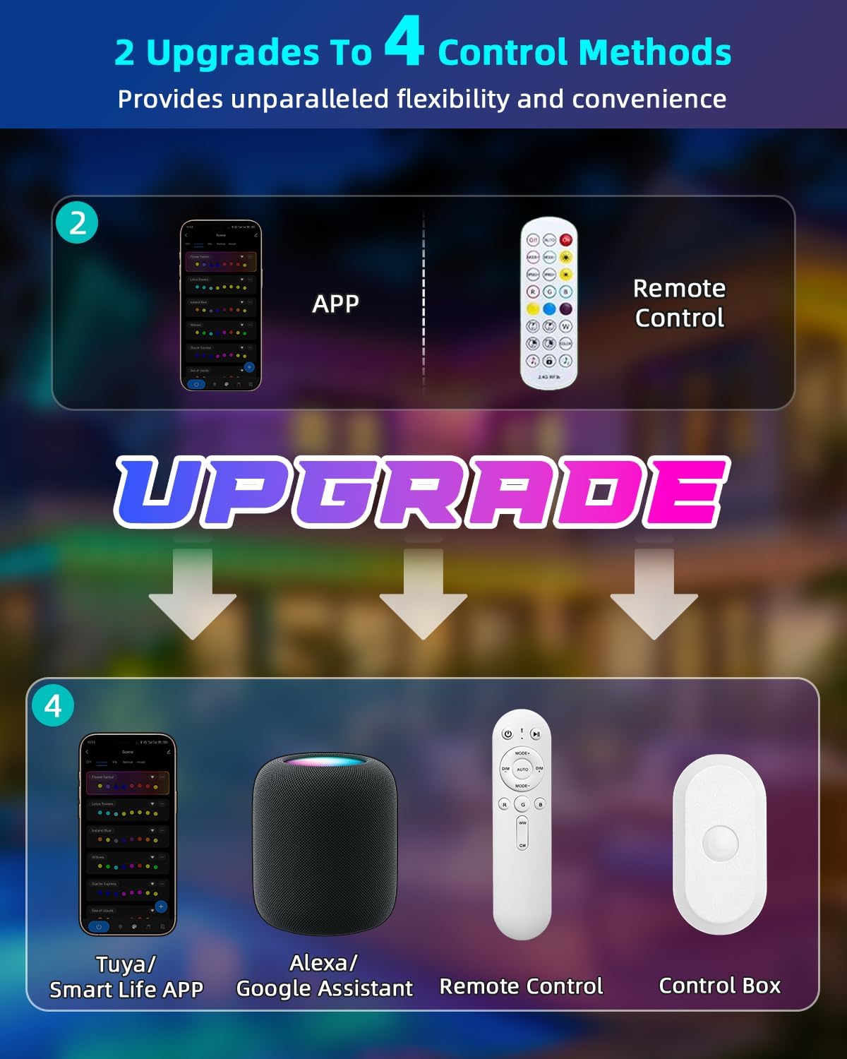 Smart Voice, App & Remote Control: With the Tuya or Smart Life app, you can access over 40 preset lighting themes or create your own custom patterns, colors, and brightness levels. And the permanent lights work with Alexa and Google Assistant, , just say the word to turn lights on/off, adjust brightness, or switch colors hands-free