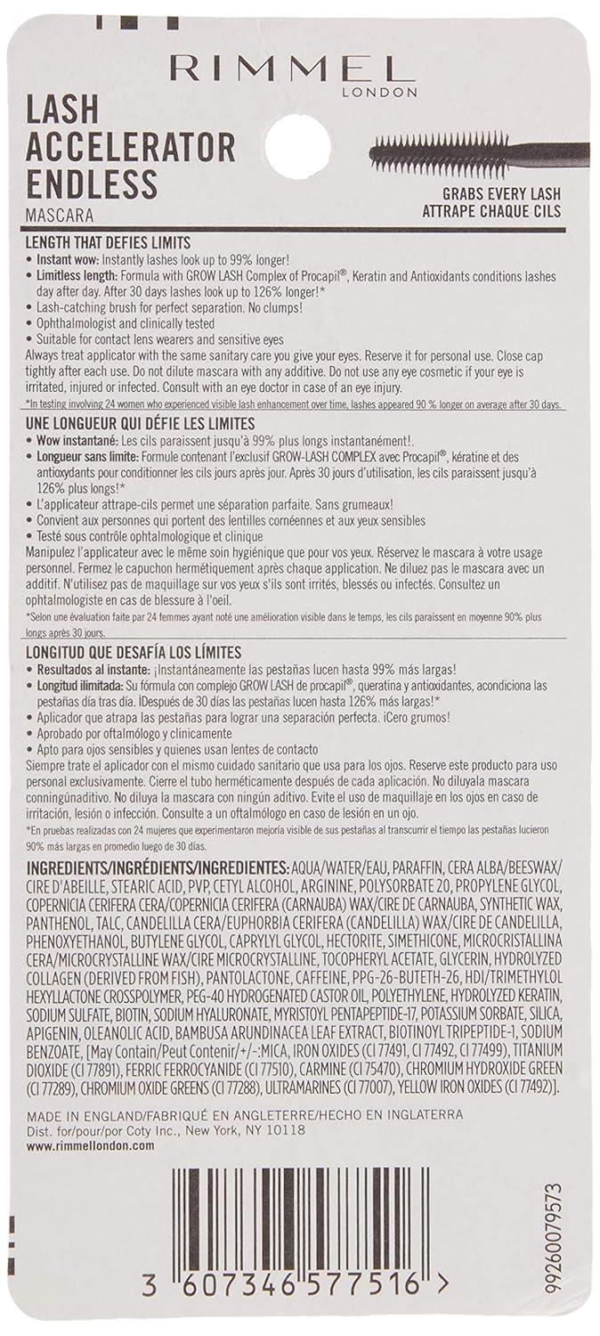 Up to 117% longer in 30 days! Rimmel’s Lash Accelerator Endless Volume Mascara has an advanced ultra-lengthening formula for beautifully long, remarkably strong lashes. With continued use of this mascara, lashes will not only look longer, but lusher and more numerous.