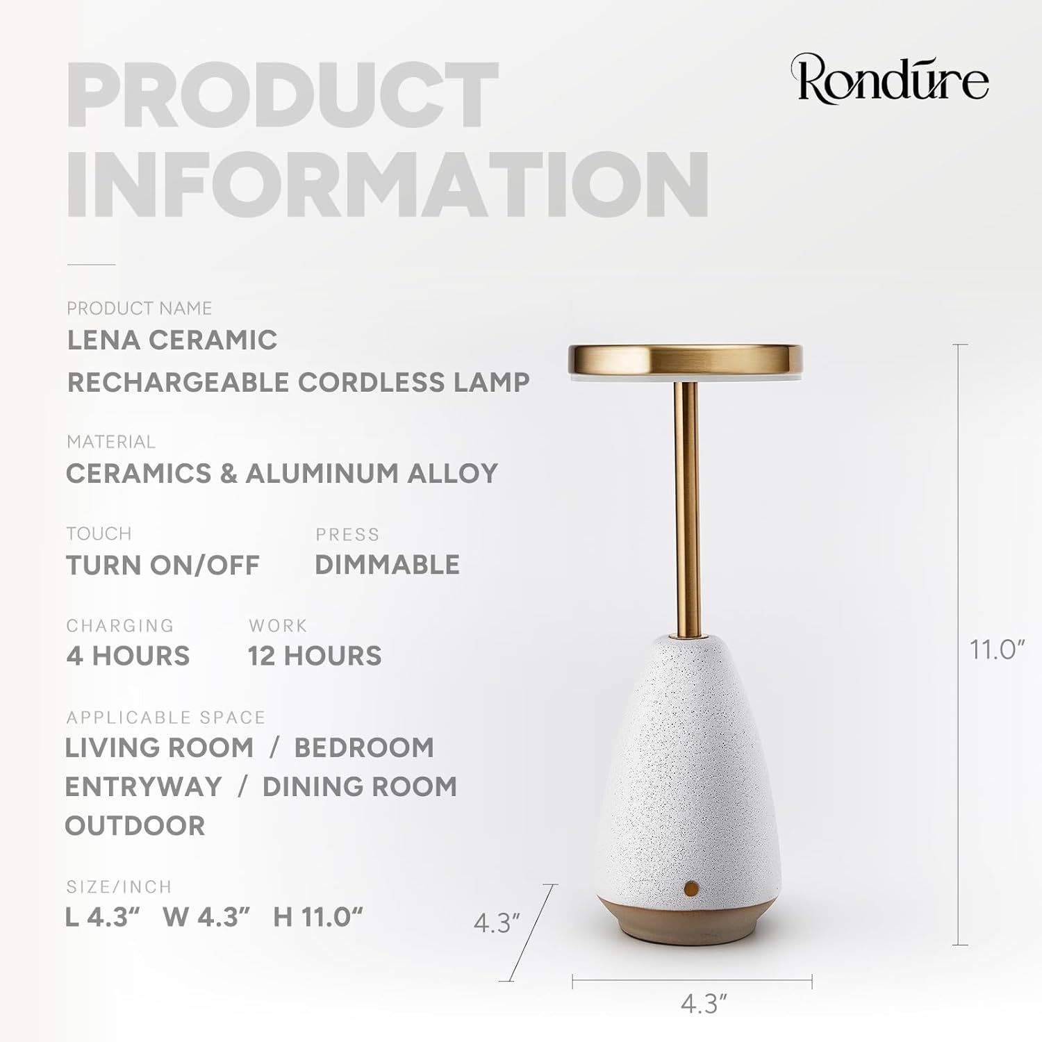 RONDURE 11.0″ Ceramic Cordless Table Lamp, Portable Rechargeable Table lamp, Touch Dimmable Warm Ambient Lighting for Living Room, Bedroom, Dining Room, Fast Charging & Long Lasting