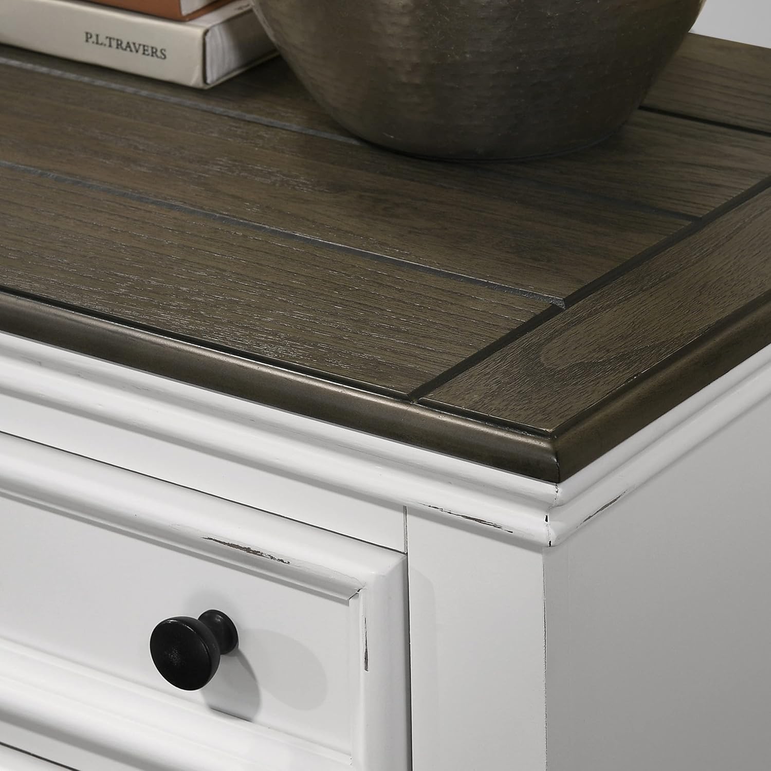 English dovetail drawer construction with full extension metal ball bearing drawer glide. 5-step process weathered white finish with preserving lacquer top coat, dark gray finished top panel