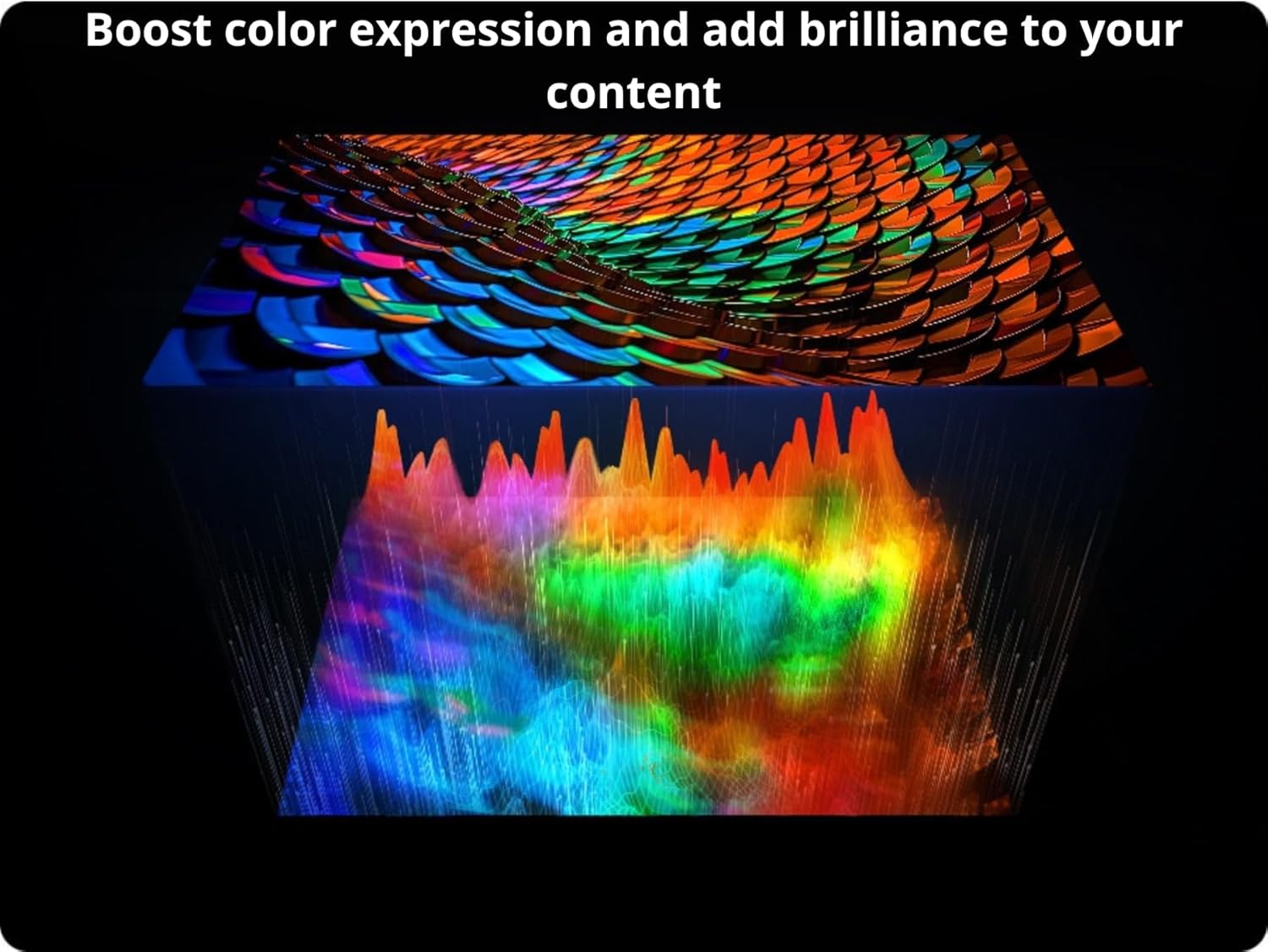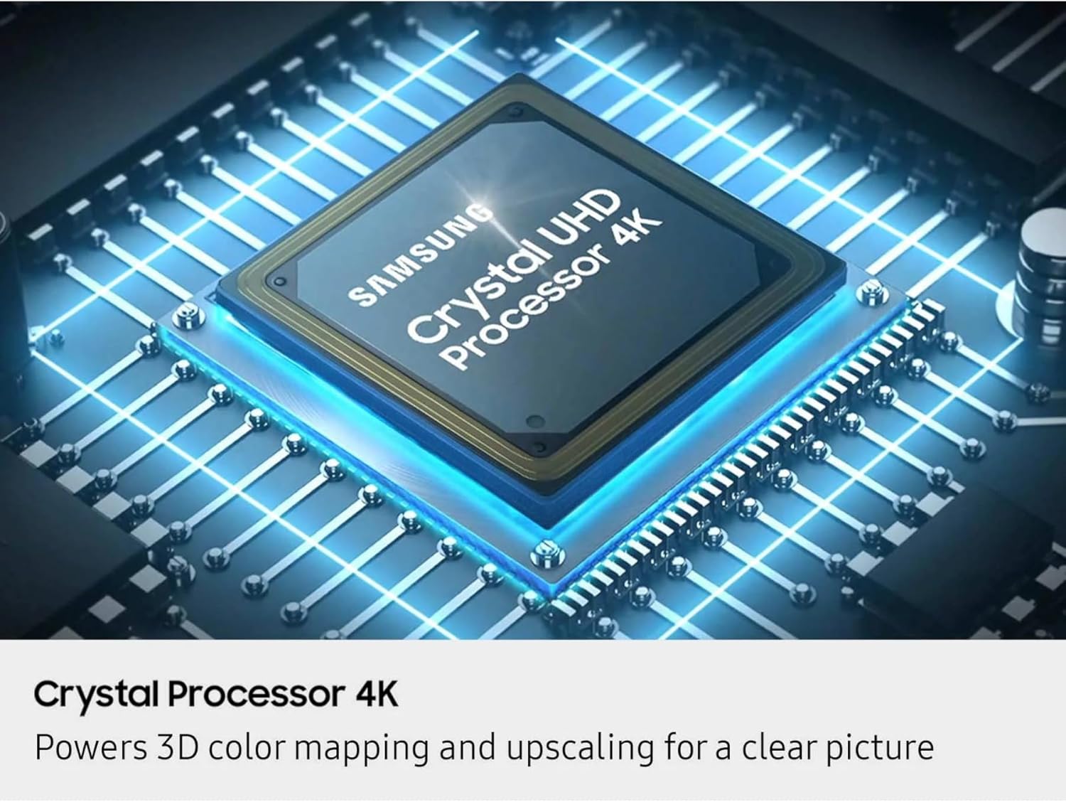Crystal Processor 4K + HDR10+/HLG: Upscales lower-resolution content to near-4K. Supports HDR10+, HLG, UHD Dimming, Contrast Enhancer, and PurColor for over 1 billion vibrant colors and deep contrast.