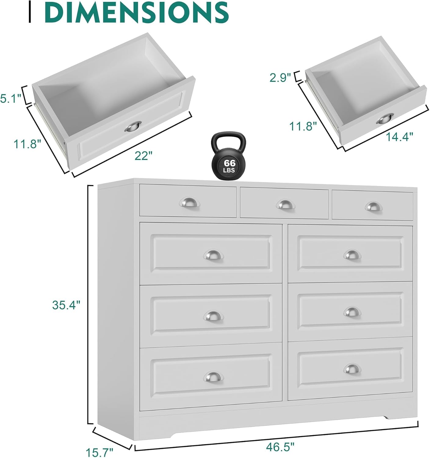 9 Drawer Chest: With nine 15.7″ deep drawers, this dresser is spacious enough to meet your various storage need. Say goodbye to the messy room with this dresser