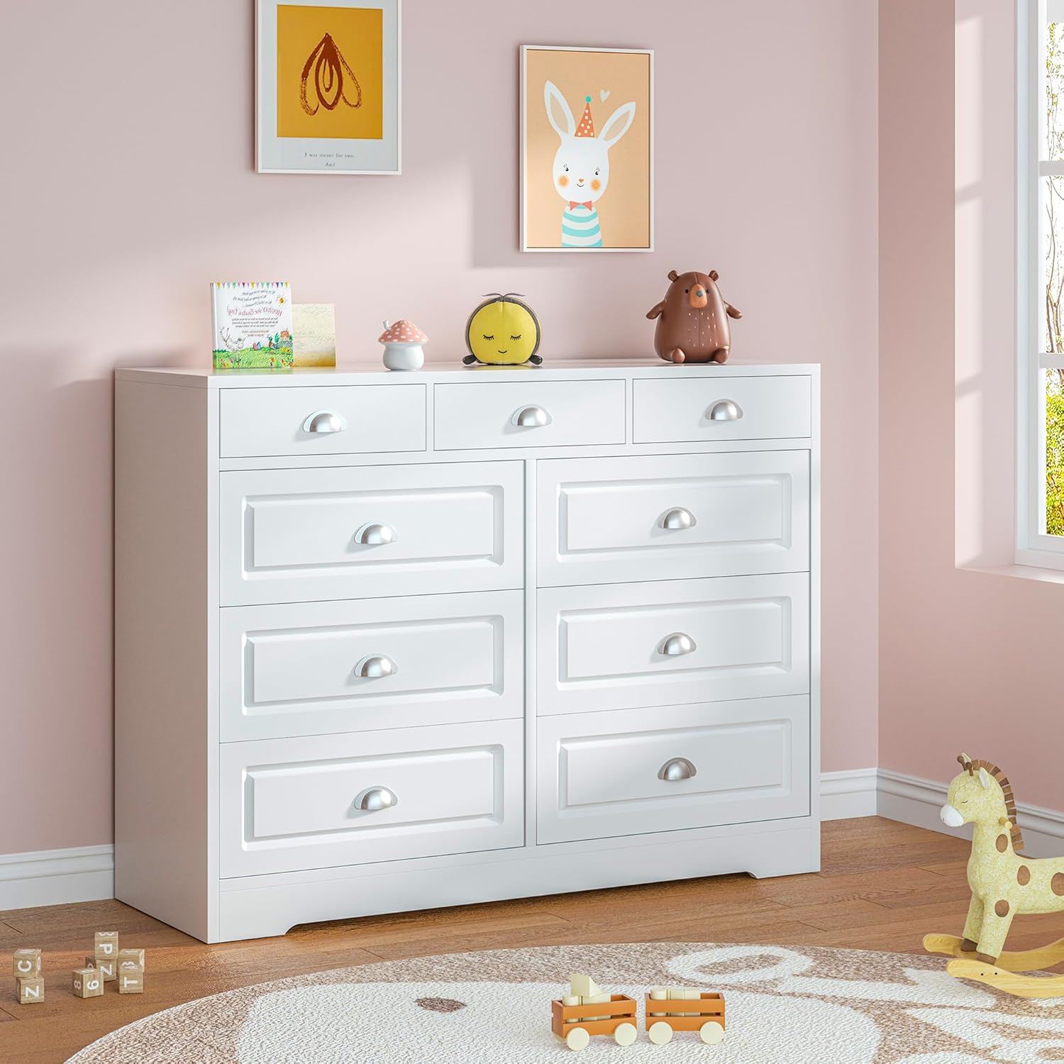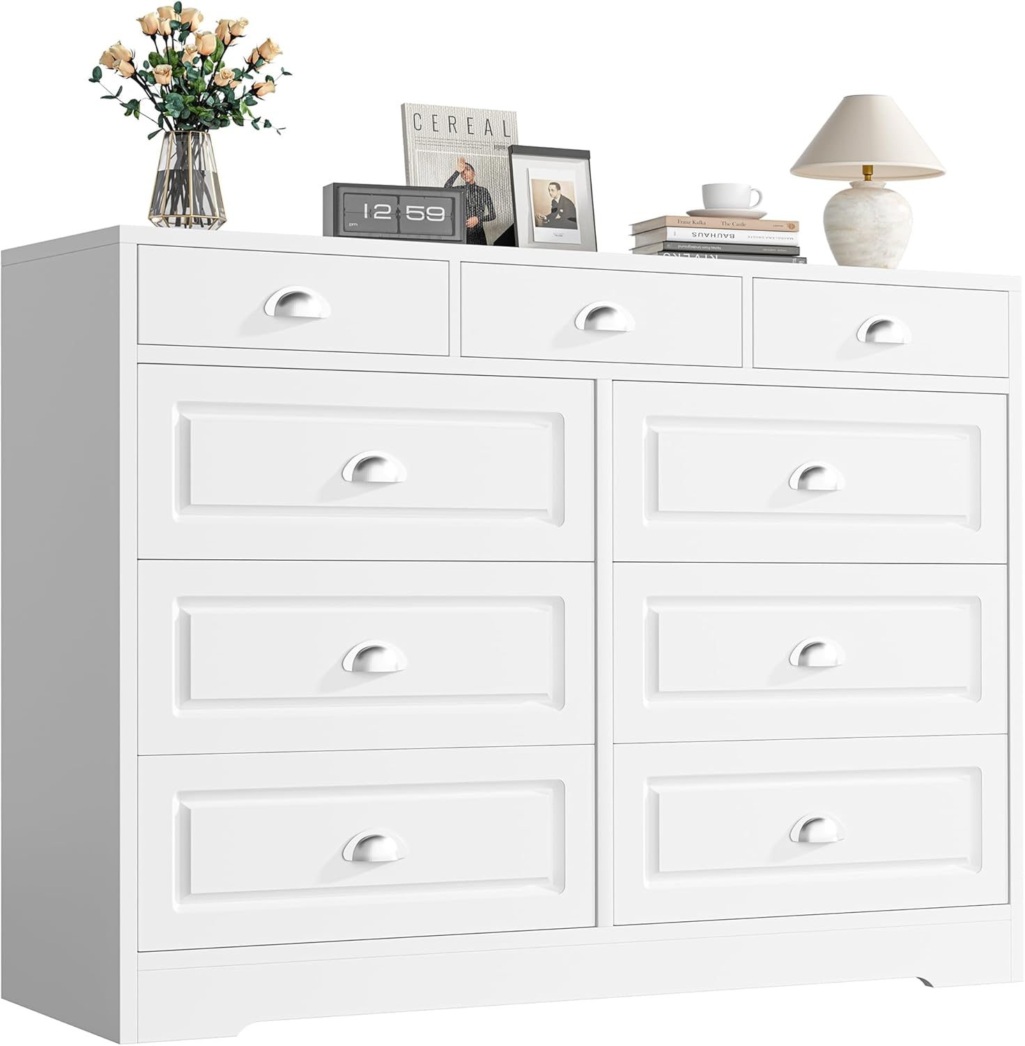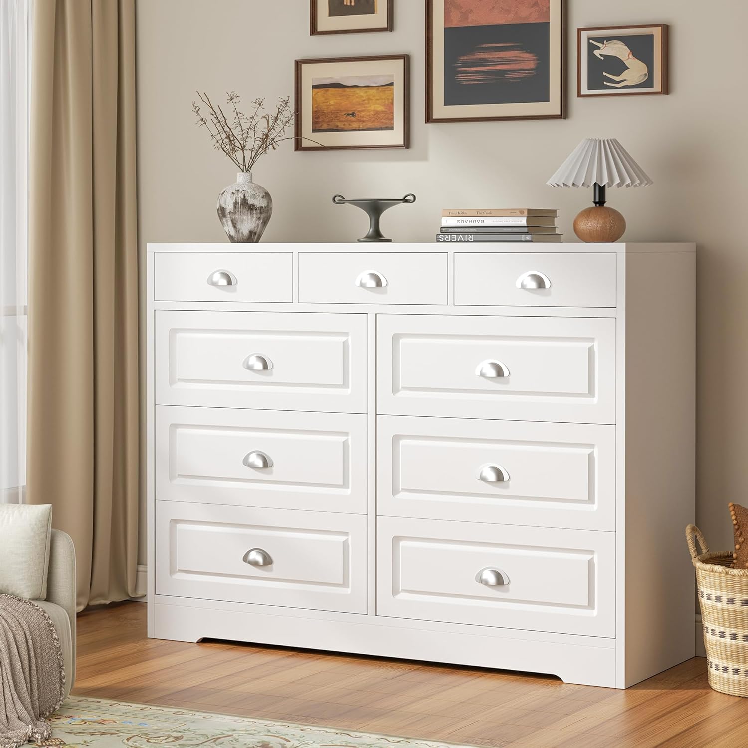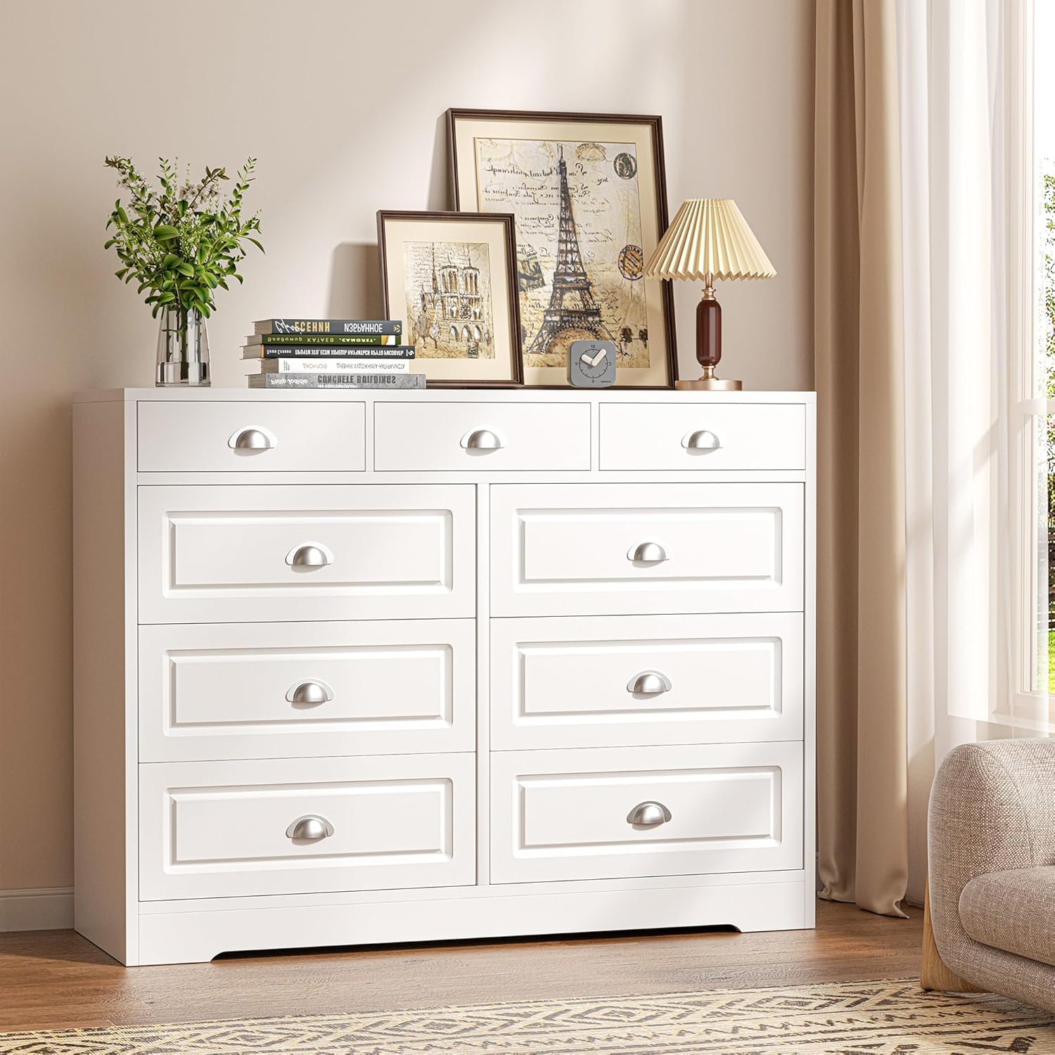 Delicate Details: The stylish design make the dresser suitable for most decor style. 9 delicate shell handles are equipped for easy pulling in and out