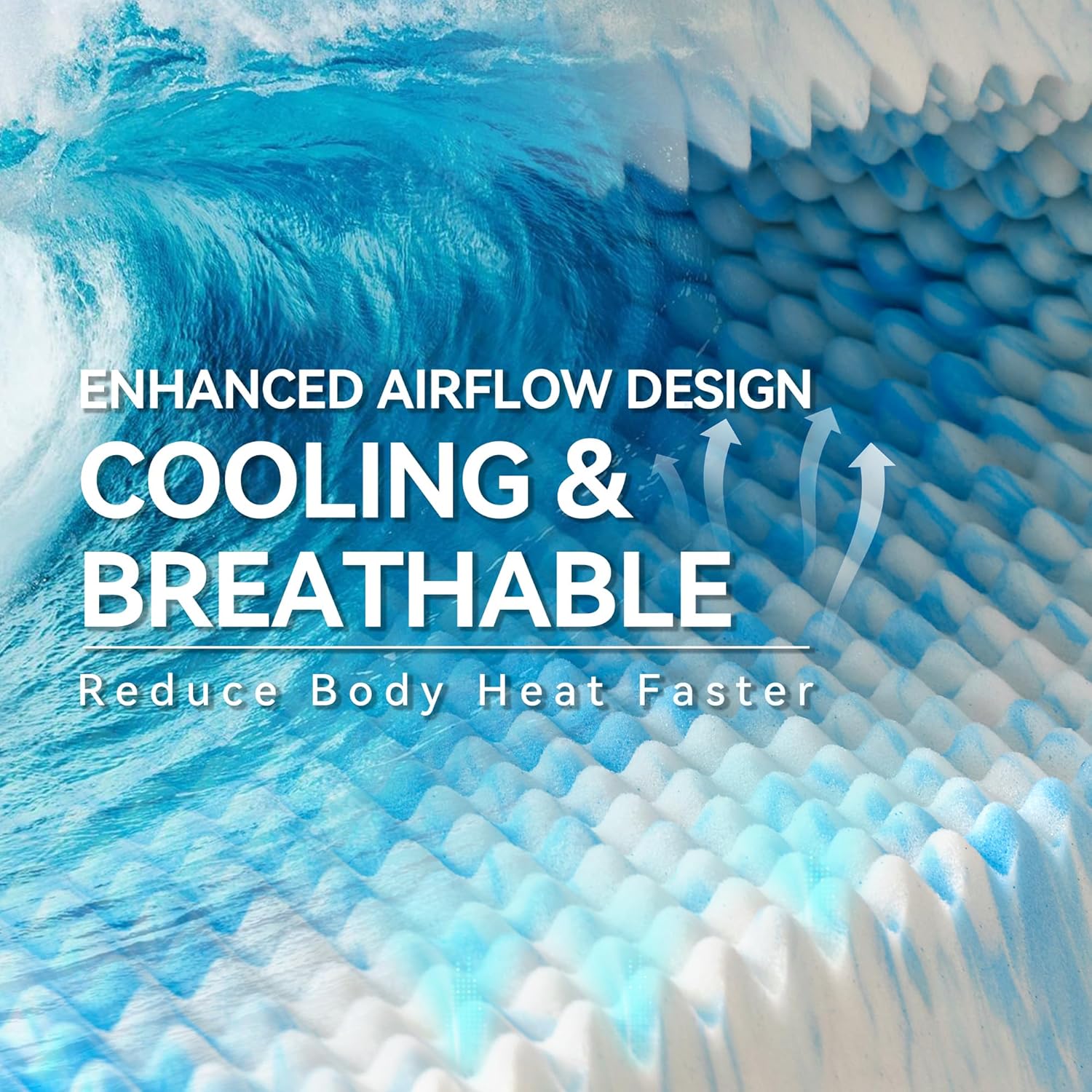 Superior Breathability: The unique structure with cooling gel infused memory foam enhances airflow and boosts cooling sensation, reducing humidity and heat buildup for a cooler and more comfortable sleeping environment.