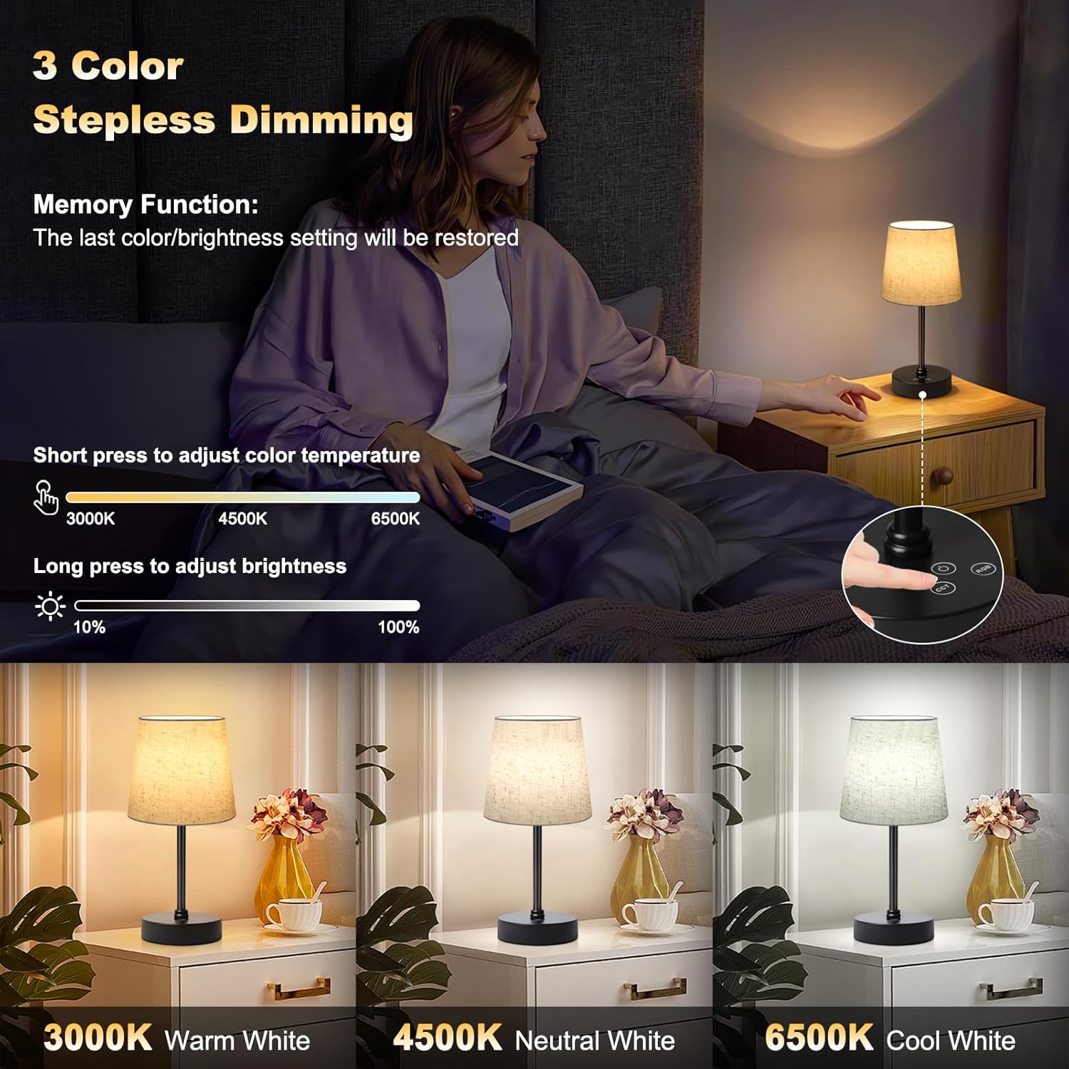 3 Color Stepless Dimmable: Enhance your lighting experience with our touch controlled desk lamp.Short press to toggle between 3 different lighting modes:3000K Warm White/4500K Neutral White/6500K Cool White. Long press to control the brightness of the light (10%-100%).Lightweight and portable, suitable for bedroom/family gatherings/dinner party lighting and other places to create a romantic atmosphere for you