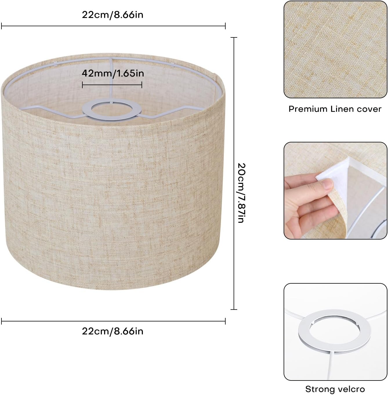 Lampshade Dimensions & Packaging: With a top diameter of 8.66 inches, a bottom diameter of 8.66 inches, and a height of 7.87 inches, this small lampshade is designed to fit a variety of lighting fixtures. Each lampshade in the set of 2 lampshades includes three adapters to ensure compatibility with different lighting setups. Detailed views of the adapters can be found in the product images.