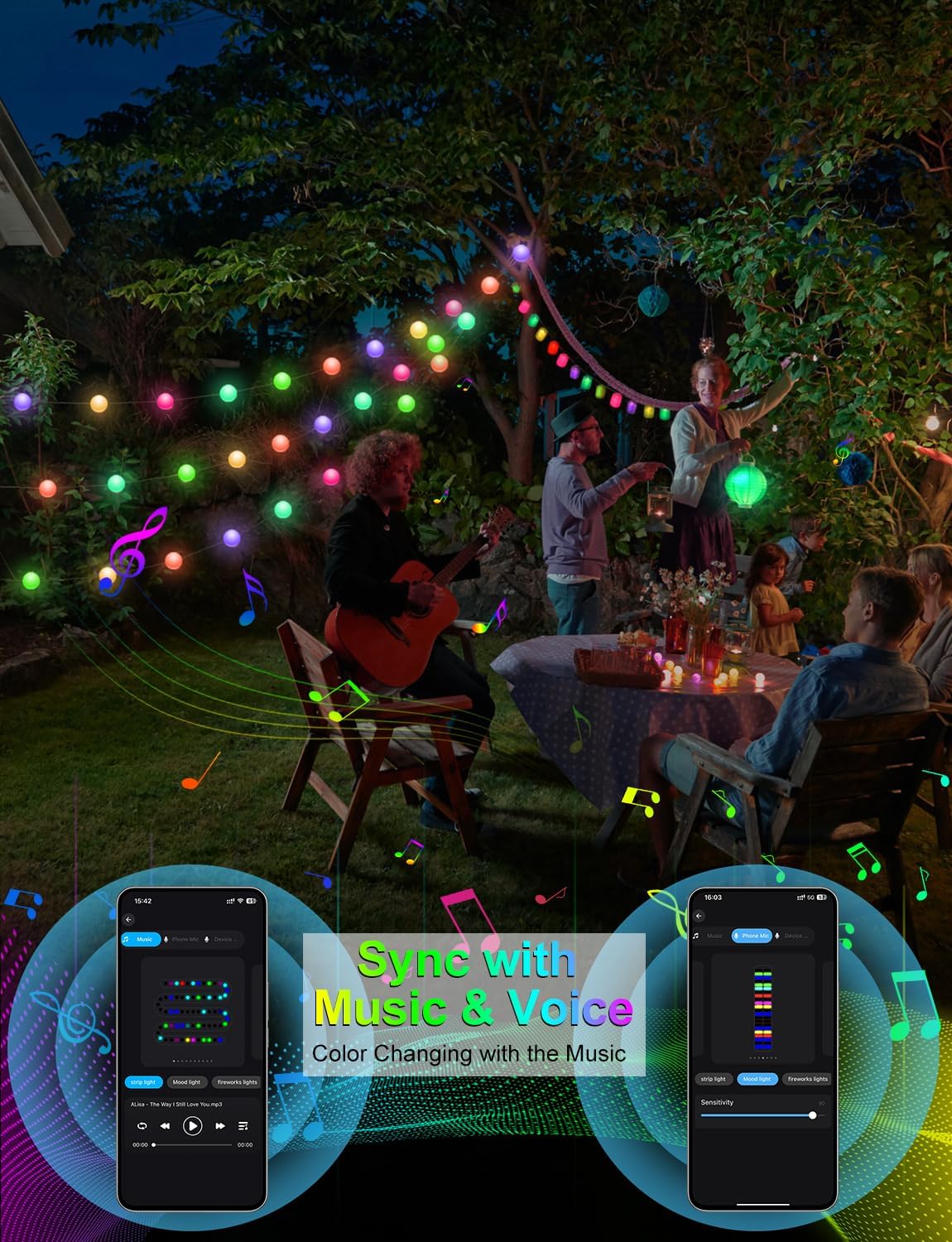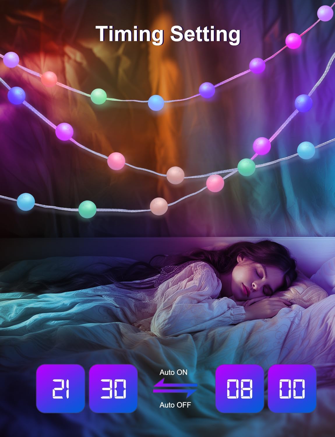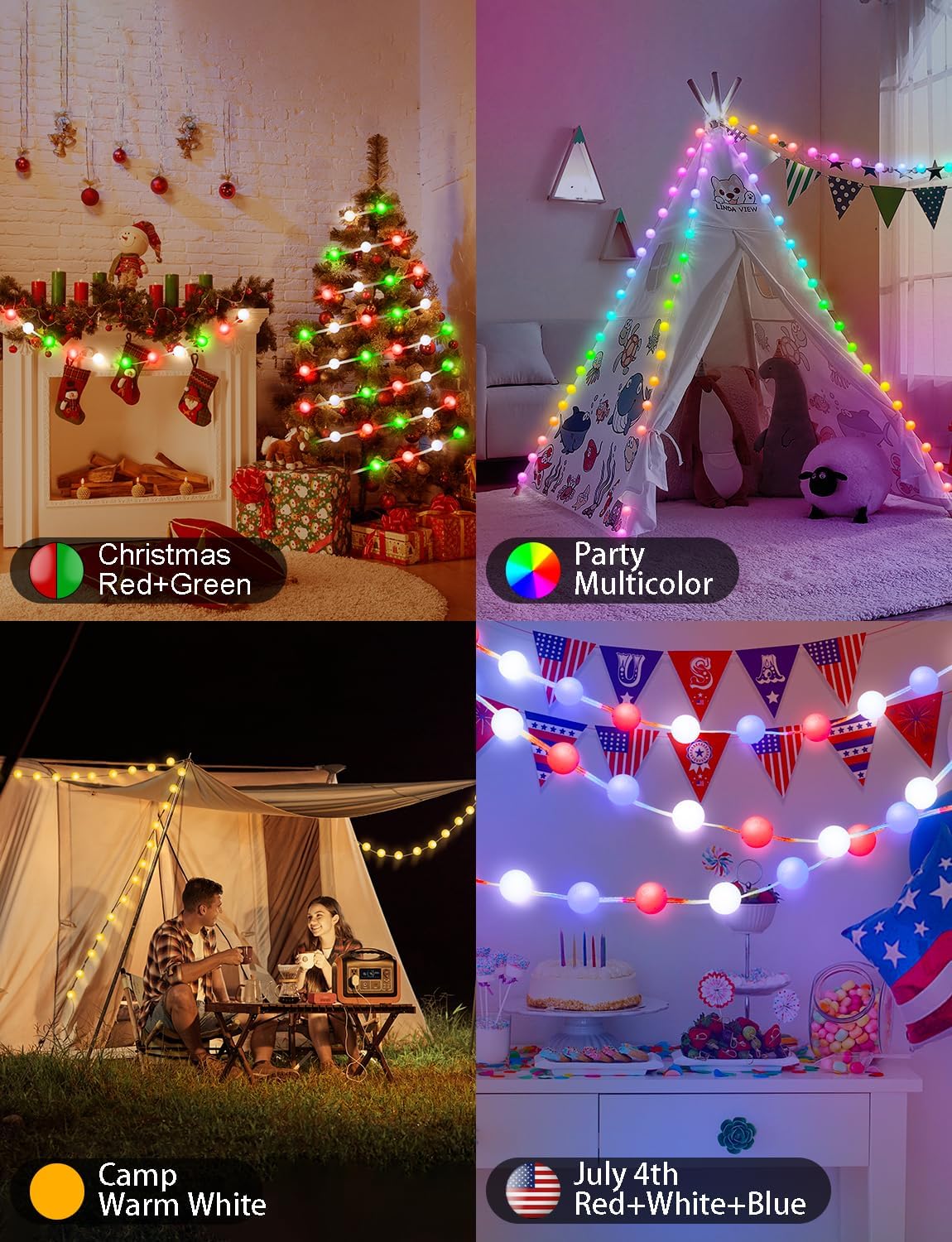 Smart String Lights: 32.8Ft smart string lights with 66 LED acrylic globe, feature frosted shell, which are non fragile and emit soft, non-dazzling light effect, create a more romantic,dreamy atmosphere in dark outdoor and indoor environ, perfect for decorating in kid’s bedrooms, tents, garden,Also perfect for Christmas gift,Birthday gift