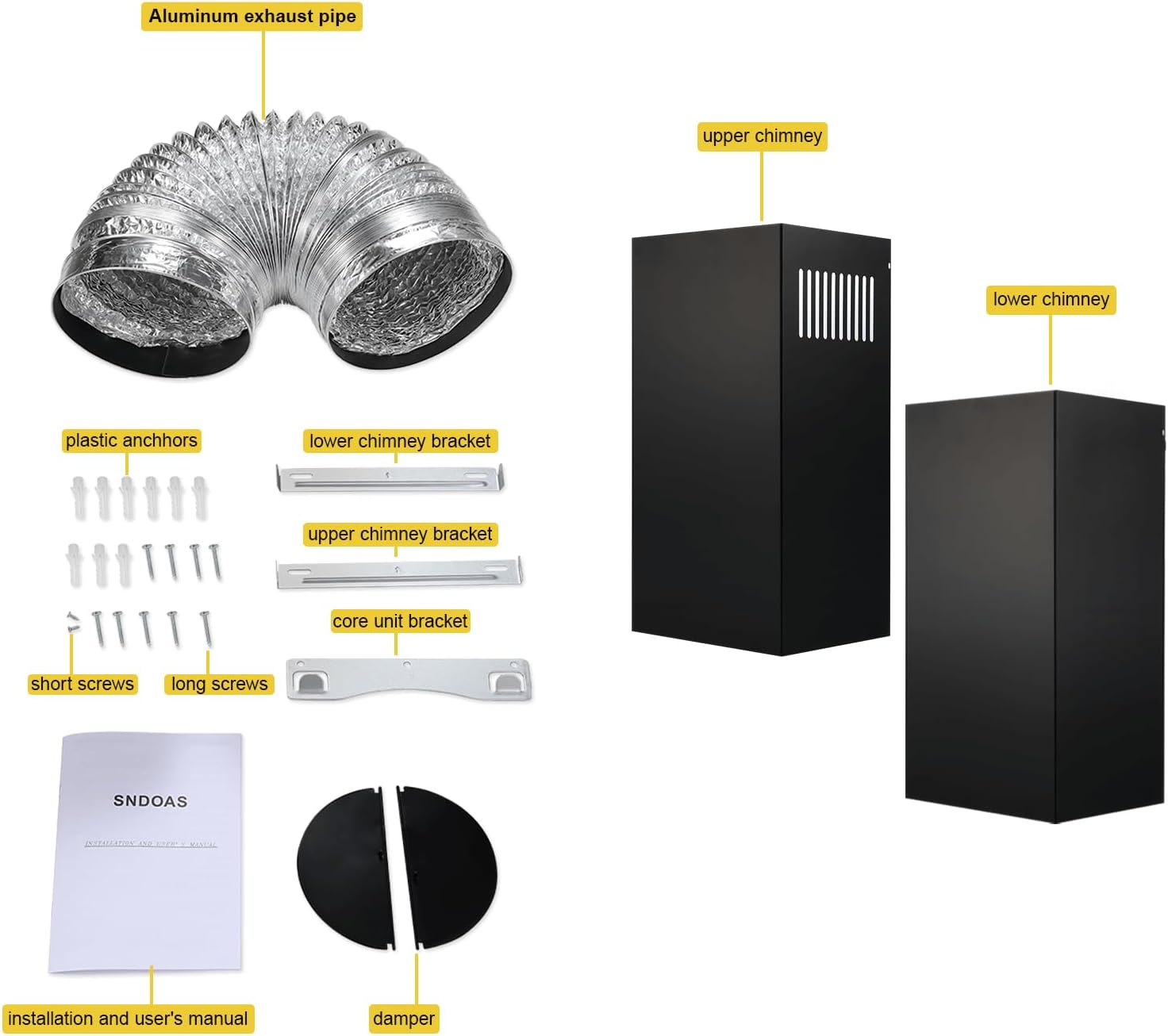 【3-year Limited Parts】:Black painted stainless steel stove vent hood, comes with hardware, instructions, duct pipe, air backdraft damper and chimney flue duct covers. 120V/60Hz, 3-prong plug. Please install the range hood according to the product manual and please feel free to contact us if you need any assistance.