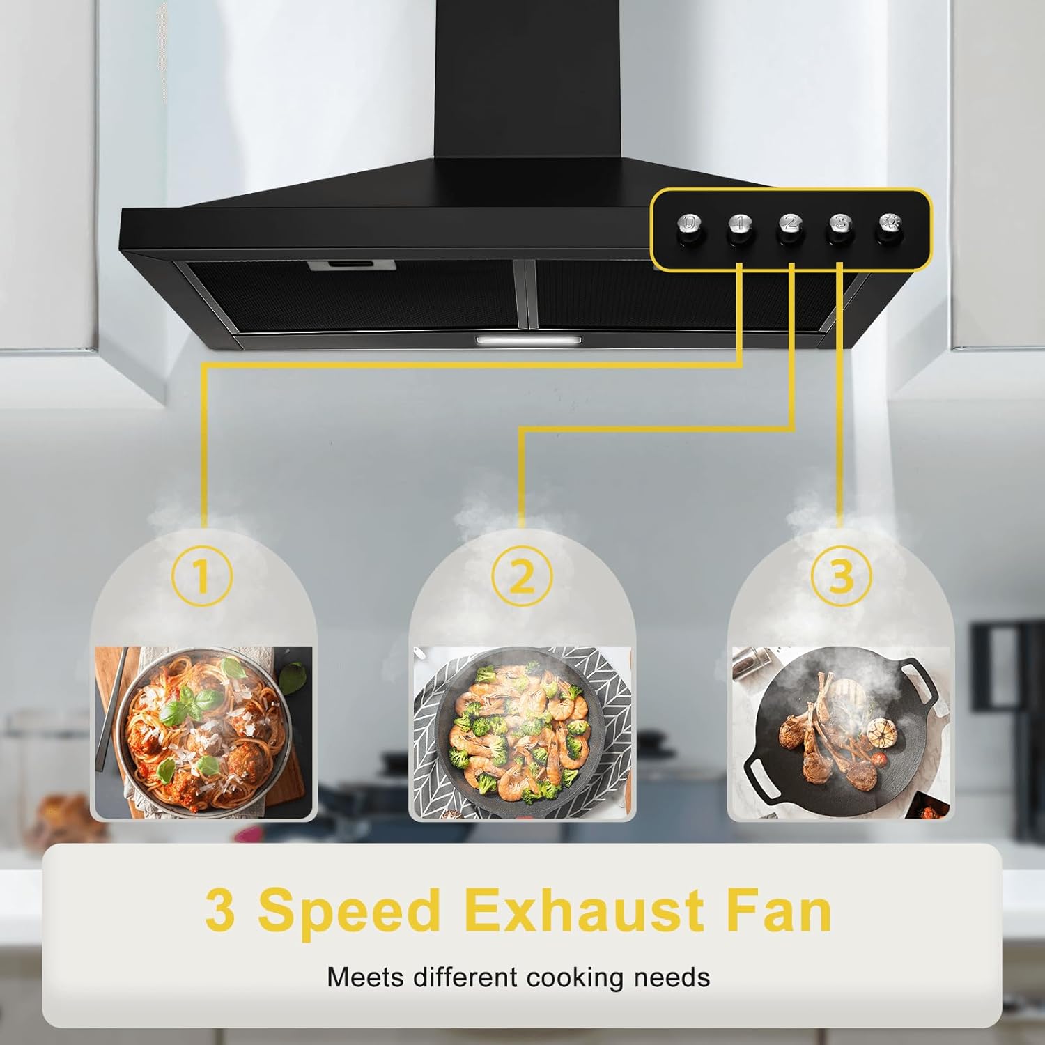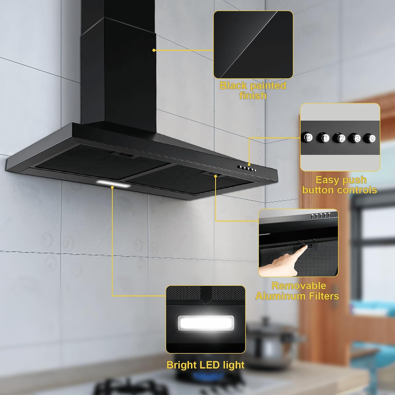 Simple installation and convenient operation range hood consist of elegant matte black painted which upgrade your kitchen style. Premium 430 grade stainless steel body is easy to clean and maintain its appearance .High-performance motor effectively pull smell and smoke during your cooking.
