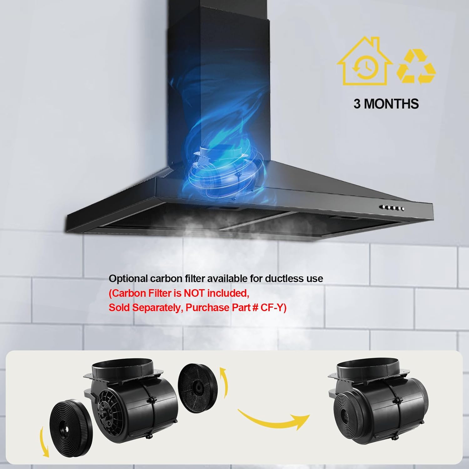 【Ducted / Ductless Convertible Kitchen Hood Vent】:This kitchen hood has a 6 inch round top vent and comes with a 6.5ft aluminum exhaust pipe,can be vented outside. Optional carbon filter kit for ductless use(Carbon Filter kit is NOT included, Sold Separately, Purchase Part # CF-Y).
