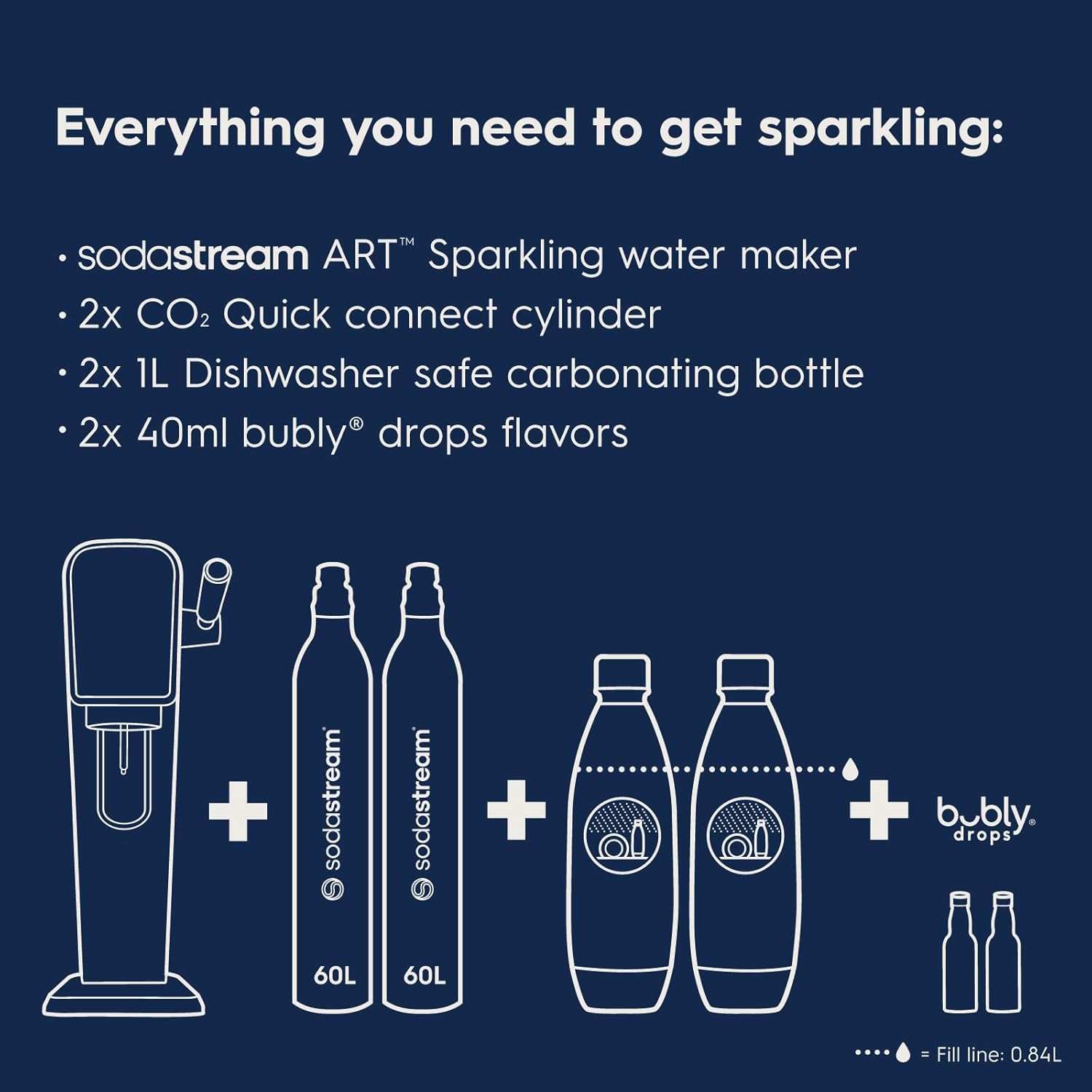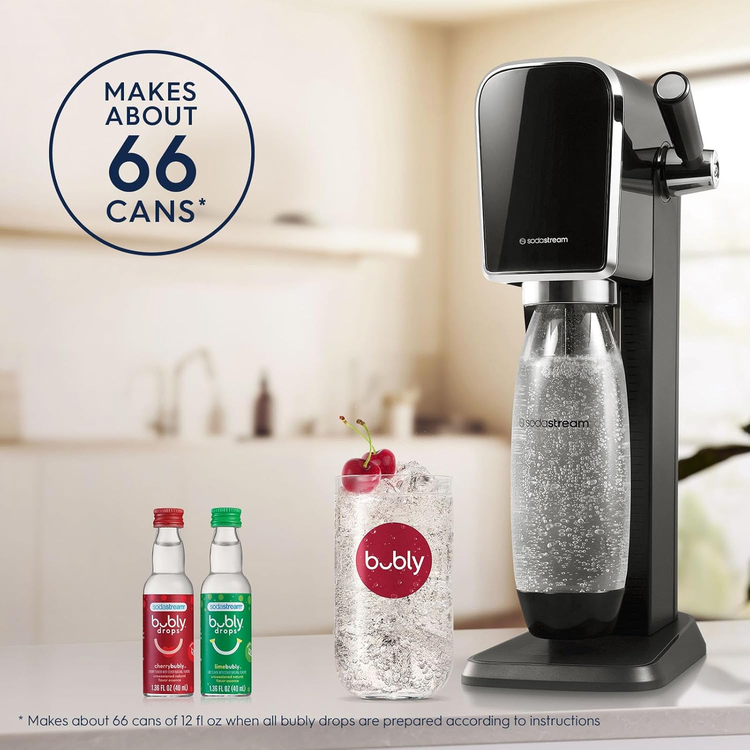Discover the elegance of sparkling water creation with the SodaStream ART Sparkling Water Maker Value Bundle in Black. The SodaStream ART is designed for those who appreciate both style and functionality in their kitchen. This bundle includes everything you need to create fresh, fizzy drinks at home: a sparkling water maker, two quick connect CO2 cylinders, two 32 Fl Oz dishwasher-safe, BPA-free & reusable carbonating bottles, and two 1.36 Fl Oz Bubly flavor drops.